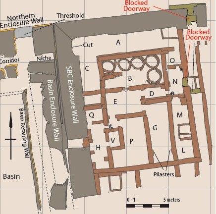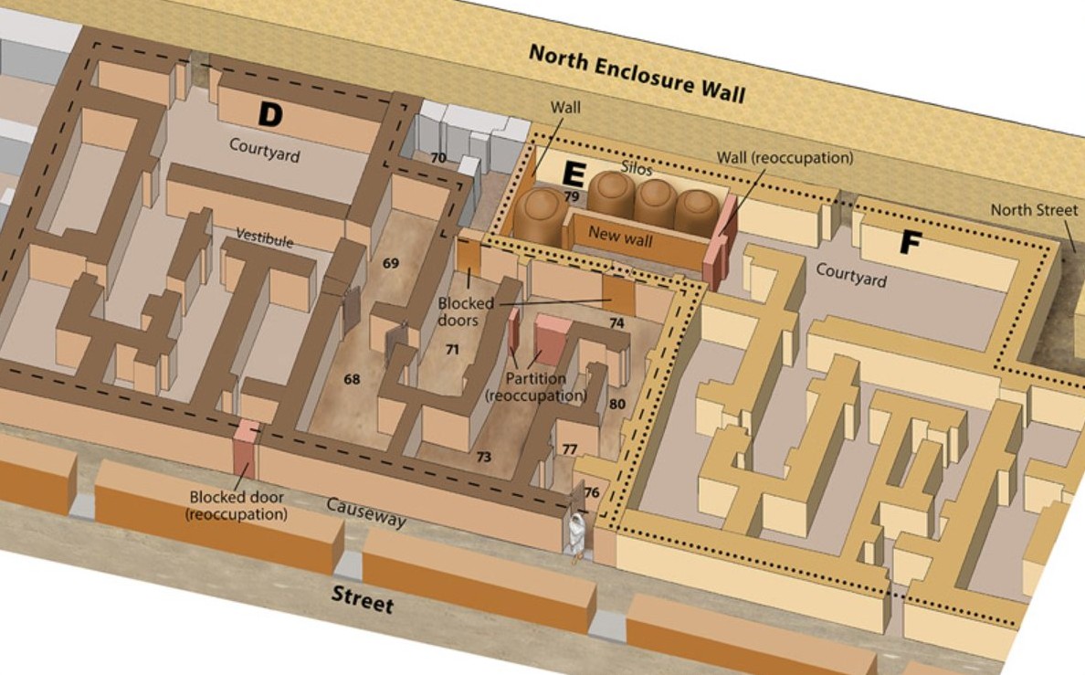 Esso si estende verso est in leggera discesa fino ad una depressione rocciosa che costrinse i costruttori a continuare la costruzione perpendicolarmente alla parte già completata; era delimitato a nord e a sud da lunghe mura perimetrali, aveva due grandi cisterne ed era costituito da dieci appartamenti adiacenti simili a villette a schiera, tutti della medesima metratura, costruiti con mattoni di fango e decorati con intonaco giallo.