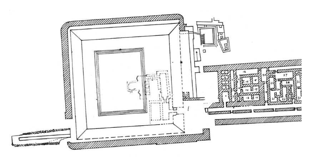 Pianta della mastaba: si notino nell’angolo inferiore a sinistra il pozzo per la barca sacra; attorno all’edificio ed adiacente ad esso, il muro di cinta che circonda i lati sud, ovest e nord; sull’angolo nord est la vasca e sulla destra le prime abitazioni del complesso sacerdotale