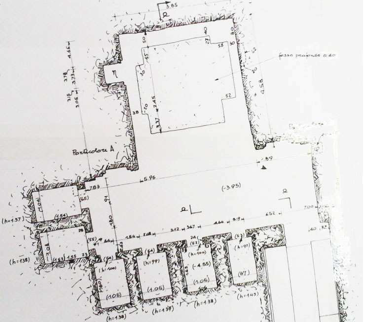 Pianta della sottostruttura; si nota il vestibolo al centro sul quale si affacciano i magazzini e la camera sepolcrale , caratterizzata dalla fossa rettangolare che la occupa quasi per intero.
