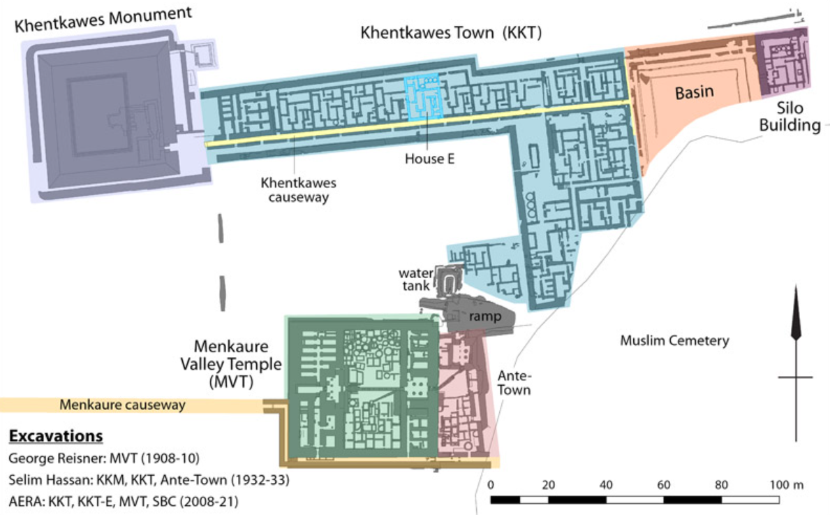 Pianta del sito: in basso a sinistra sono indicati gli egittologi che vi lavorarono e gli anni delle campagne dagli stessi effettuate. Per una migliore comprensione, MVT = tempio a valle di Micerino; KKM = Mastaba di Khentkaus; KKT = Città di Khentkaus; Ante-town = zona ad est del tempio di Micerino; KKT-E = edificio E della città di Khentkaus, SBC = Complesso dei silos. Negli edifici a destra della zona colorata in grigio poteva avere sede la casa della mummificazione, e la vasca potrebbe essere stata utilizzata per i riti di purificazione della regina. Nell’area definita Ante-town forse sorgeva il tempio a valle di Khentkaus.