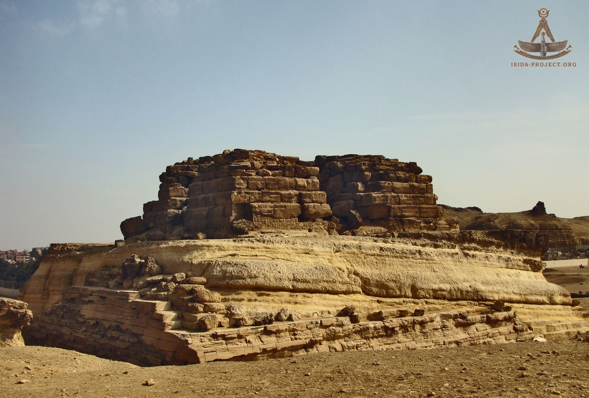 Vista posteriore della mastaba. Lungo la base del lato sud è visibile la decorazione a facciata di palazzo, mentre sul lato a nord si nota ancora parte del rivestimento. Immagine da https://isida-project.org/egypt_april_2019/khentkaus_en.htm