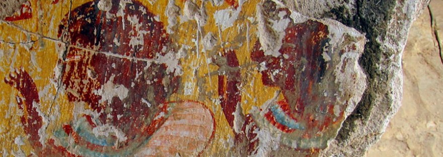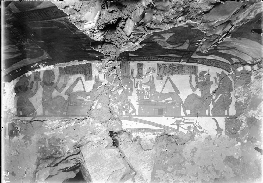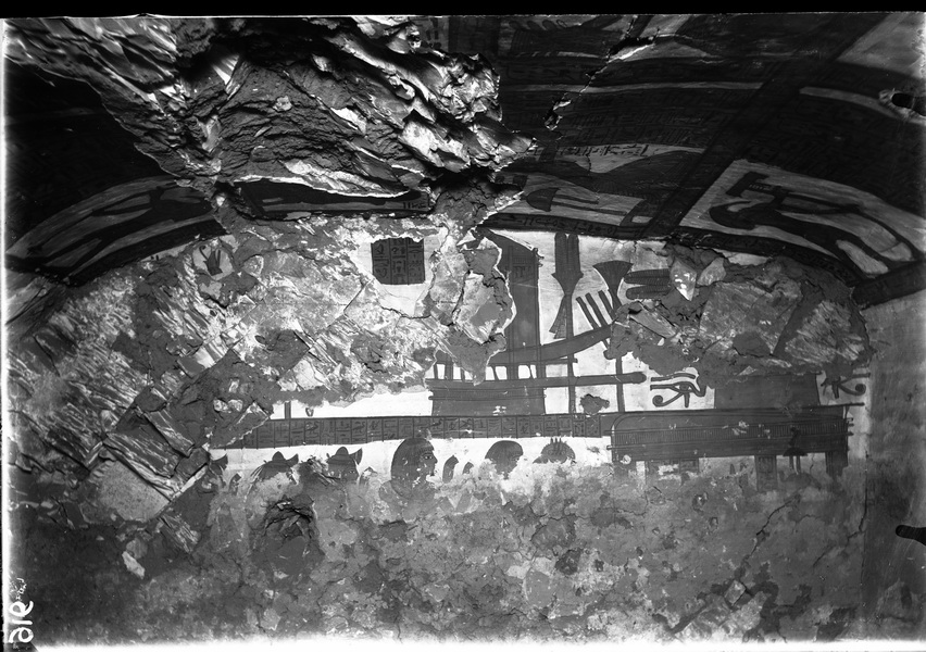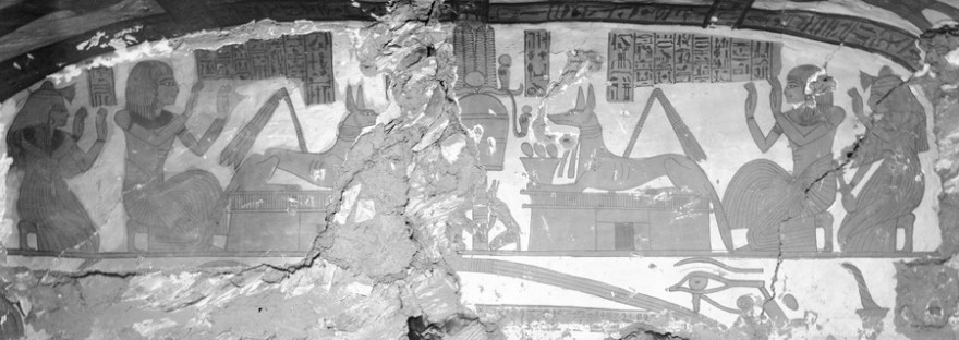 La parete nord, gravemente danneggiata, e parte del soffitto della camera mortuaria della TT211 con una scena di adorazione di Osiride all’interno di un santuario. Foto: Museo Egizio di Torino