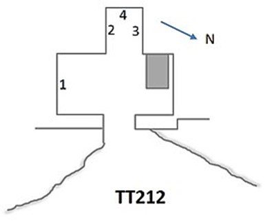Originariamente TT212, peraltro mai ultimata, era costituita da un cortile esterno che dava accesso ad una cappella che presentava una profonda nicchia sul fondo. Attualmente, il cortile è indistinto e la cappella è crollata talché il complesso è ridotto alla sola nicchia di fondo[11][12]. I pochissimi lacerti di pitture murali residui fanno riferimento a offerte da parte del defunto (2 in planimetria[13]) agli dei Thot e Harsiesi (?) e (3) del defunto e della moglie dinanzi a Osiride e Iside.
