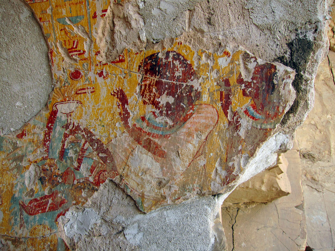 La parete ovest, gravemente danneggiata, della camera mortuaria della TT211. Foto: Museo Egizio di Torino