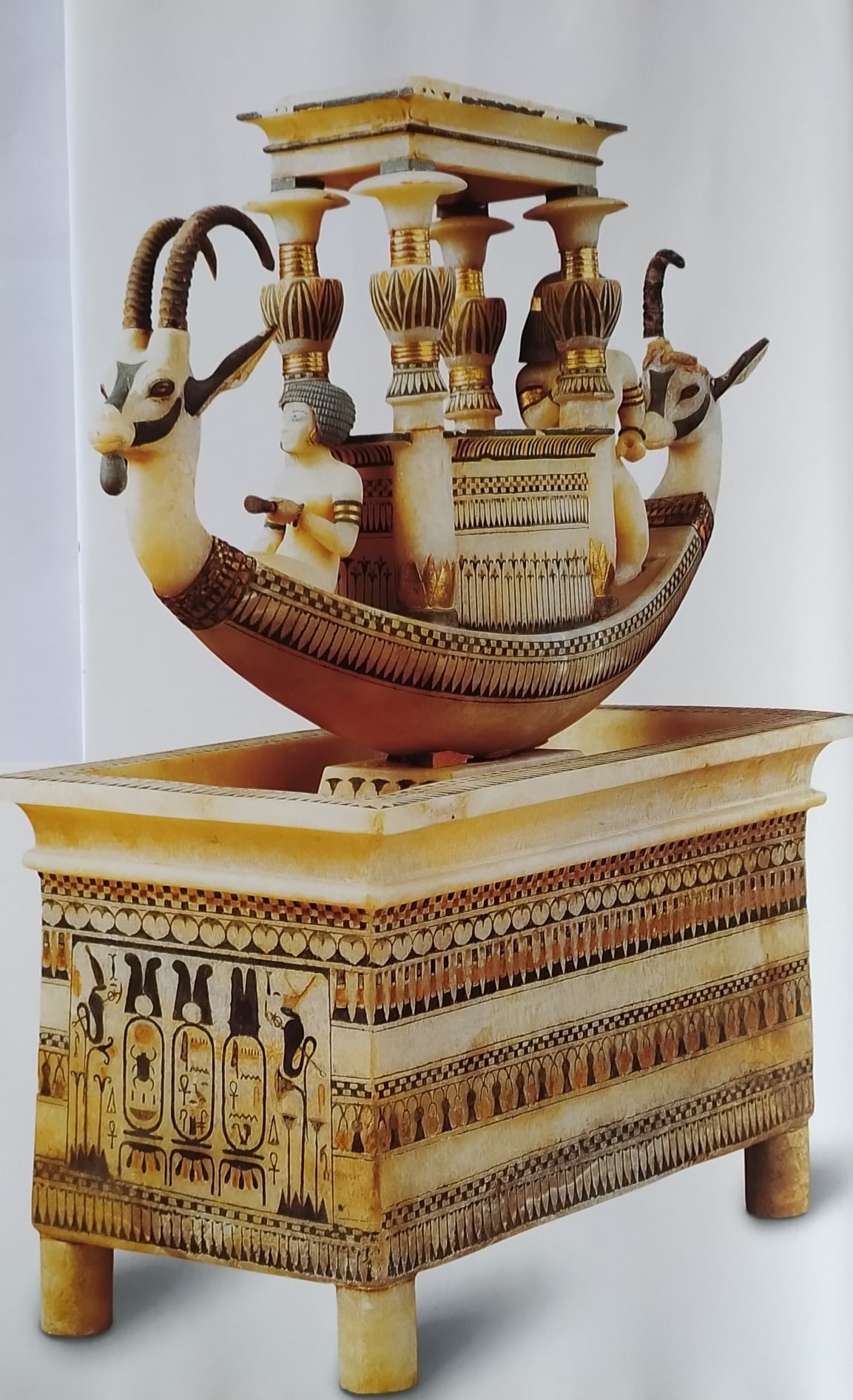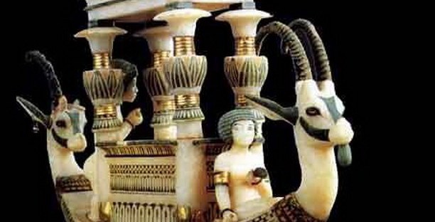 Calcite, avorio, oro, pigmenti rossi, gialli, blu e verdi. Provenienza: tomba di Tutankhamon (KV62). Museo del Cairo: JE 62119.