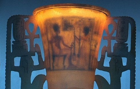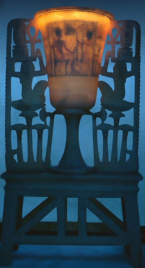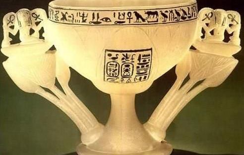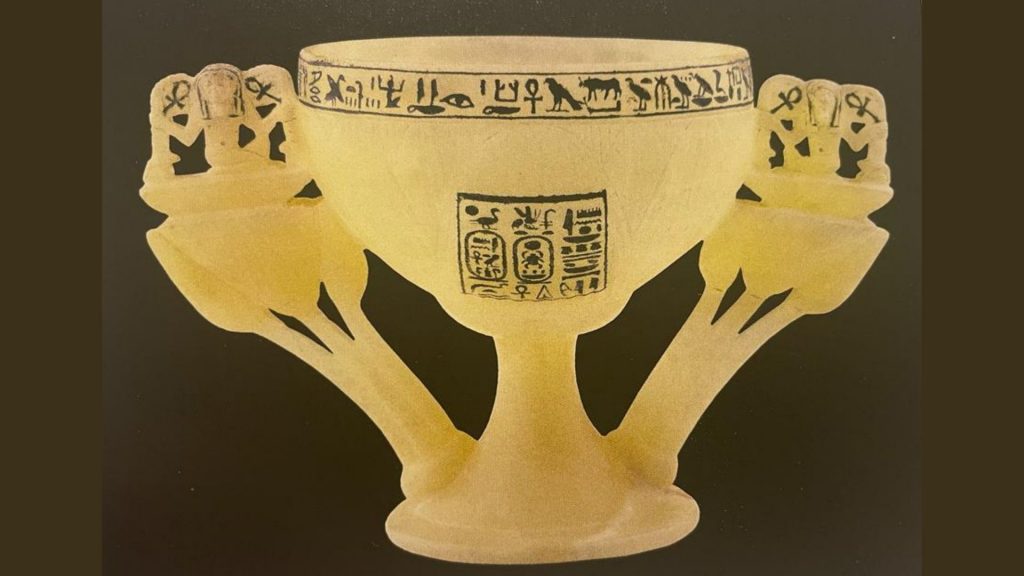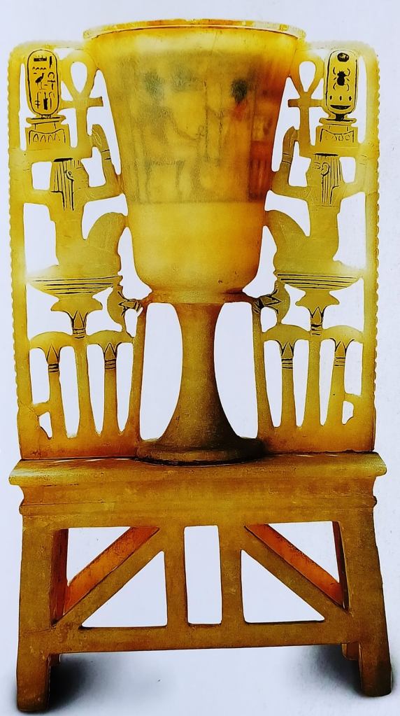 Quando sul pavimento dell’anticamera fu scorta questa meraviglia, un oggetto in alabastro traslucido che, alla luce delle torce, rimandava bellissimi riflessi, Carter ne restò particolarmente affascinato. Si trovava lì, sicuramente abbandonata dai profanatori, probabilmente colti sul fatto. Si tratta di un calice a forma di fior di loto in piena fioritura con i petali arrotondati magnificamente scolpiti in bassorilievo. E’ ricavata da un unico blocco di calcite ed è sostenuta da un piede a forma di tromba rovesciata dal quale si dipartono due elaborate composizioni che vanno a costituirne i manici. Tre steli per ciascun lato, prendono la forma di fiori di loto blu (uno aperto e due boccioli) in cima ai quali, inginocchiata su un cesto “neb”(= signore), si staglia la figura di Heh, il dio simboleggiante l’eternità. Tiene in ciascuna mano un ramo di palma le cui tacche per il computo rappresentano il geroglifico “rnpt” (=anno). Esso poggia su un girino (equivalente di centomila) a sua volta disteso su un simbolo “shn”(= infinito). Tra le mani del dio sono presenti due “ankh”(= vita). L’intera rappresentazione è, quindi, l’augurio di regno eterno per il faraone. Il fiore di loto a calice aperto che forma la coppa è quello della varietà bianca che sembra essere stato utilizzato nell’antico Egitto espressamente come modello per la realizzazione di eleganti oggetti per servire da bere. Nella collezione dell’ Eton College è conservato il frammento di una placca che mostra Tutankhamon sorseggiare da un calice simile. La coppa è inoltre decorata da una serie di raffinate iscrizioni incise e riempite con pigmento blu. Al centro, un rettangolo riporta all’interno il nome e il prenome del faraone affiancati da un’iscrizione che lo definisce “Amato da Amon, Signore dei troni delle Due Terre e del Cielo”. Il bordo ospita, invece, due iscrizioni distribuite sulla stessa linea.