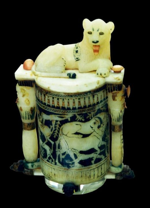 Queste sostanze rare e costosissime, molto spesso importate, erano a loro volta, per riguardo al loro valore, conservate in contenitori realizzati con materiali delicati ed altrettanto preziosi, come la calcite (o alabastro egiziano). La loro forma il più delle volte originale e di grande gusto estetico, si ispirava in genere alla flora ed alla fauna. Quando si osservano le foto scattate da Harry Burton nell’annesso, ci si rende immediatamente conto del disordine che vi regnava e dovette sembrare un miracolo che oggetti così fragili e delicati potessero essere ancora intatti. In seguito, Carter preciserà che “tra i tanti oggetti straordinari, è necessario citare il seguente esempio: un vaso con le forme di un leone mitico, in piedi in un atteggiamento aggressivo, stranamente araldico come “un leone guardiano”; la zampa destra sollevata con gli artigli all’aria in una nobile rabbia, mentre la sinistra poggia su un simbolo che significa protezione. Montato sulla corona posta sulla testa si trova il collo del vaso che rappresenta un fiore di loto che prende esso stesso la forma di una corona. La decorazione di questo oggetto è incisa e riempita di pigmenti, la lingua e i denti sono in avorio”.
