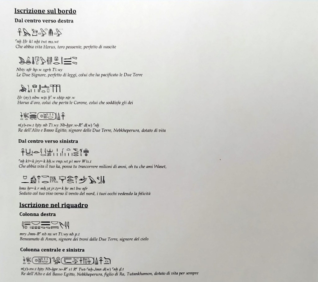 Il pannello delle iscrizioni sulla facciata minore della vasca non ci fornisce indizi sullo scopo del pezzo: contiene i cartigli con i nomi di Tutankhamon e della moglie Ankhesenamon affiancati da ureos su papiro (a destra) e su fiori di loto (a sinistra) che simboleggiano rispettivamente le dee Wadjyt (per il Basso Egitto) e Neith (stranamente, per l’Alto Egitto).
