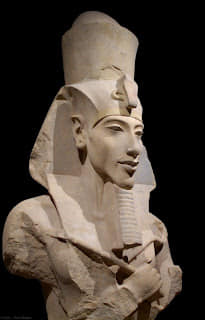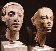 A sinistra: testa di Akhenaton; Ägyptisches Museum und Papyrussammlung, Neues Museum, Berlino. A destra: Teste di Akhenaton, a sinistra, e della grande sposa reale Nefertiti (Ägyptisches Museum und Papyrussammlung, Neues Museum, Berlino)