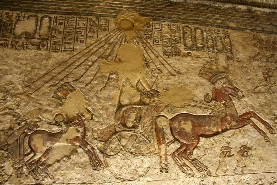 AKHENATON sul cocchio reale in un bassorilievo dipinto della tomba di MERYRA