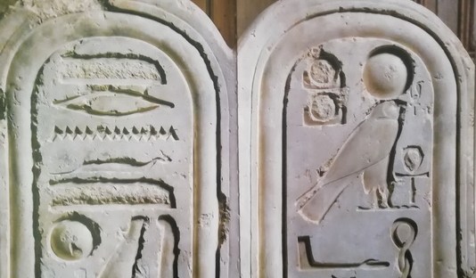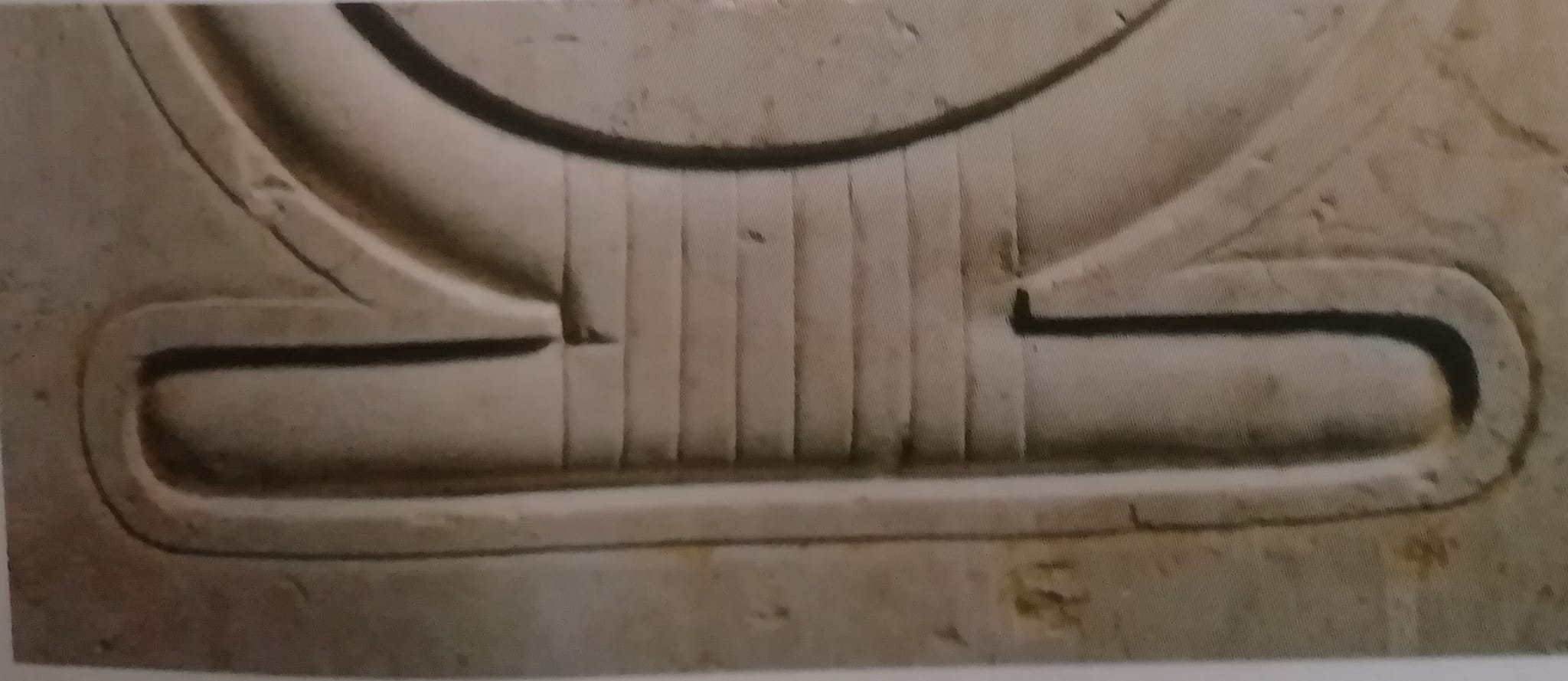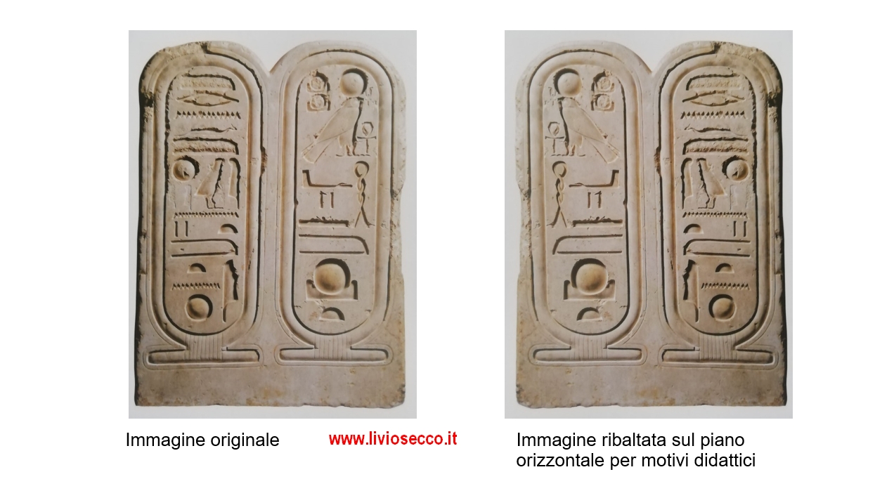 Nella parte inferiore del cartiglio di sinistra si distinguono i geroglifici che compongono il nome del dio Aton: in egizio it(e)n. Il segno verticale rappresenta un giunco che si legge ‘i’ ed è affiancato da tre geroglifici posti uno sopra l’altro, il disegno stilizzato di un pane, il segno dell’acqua e il disco solare che indica la natura divina e solare del nome.