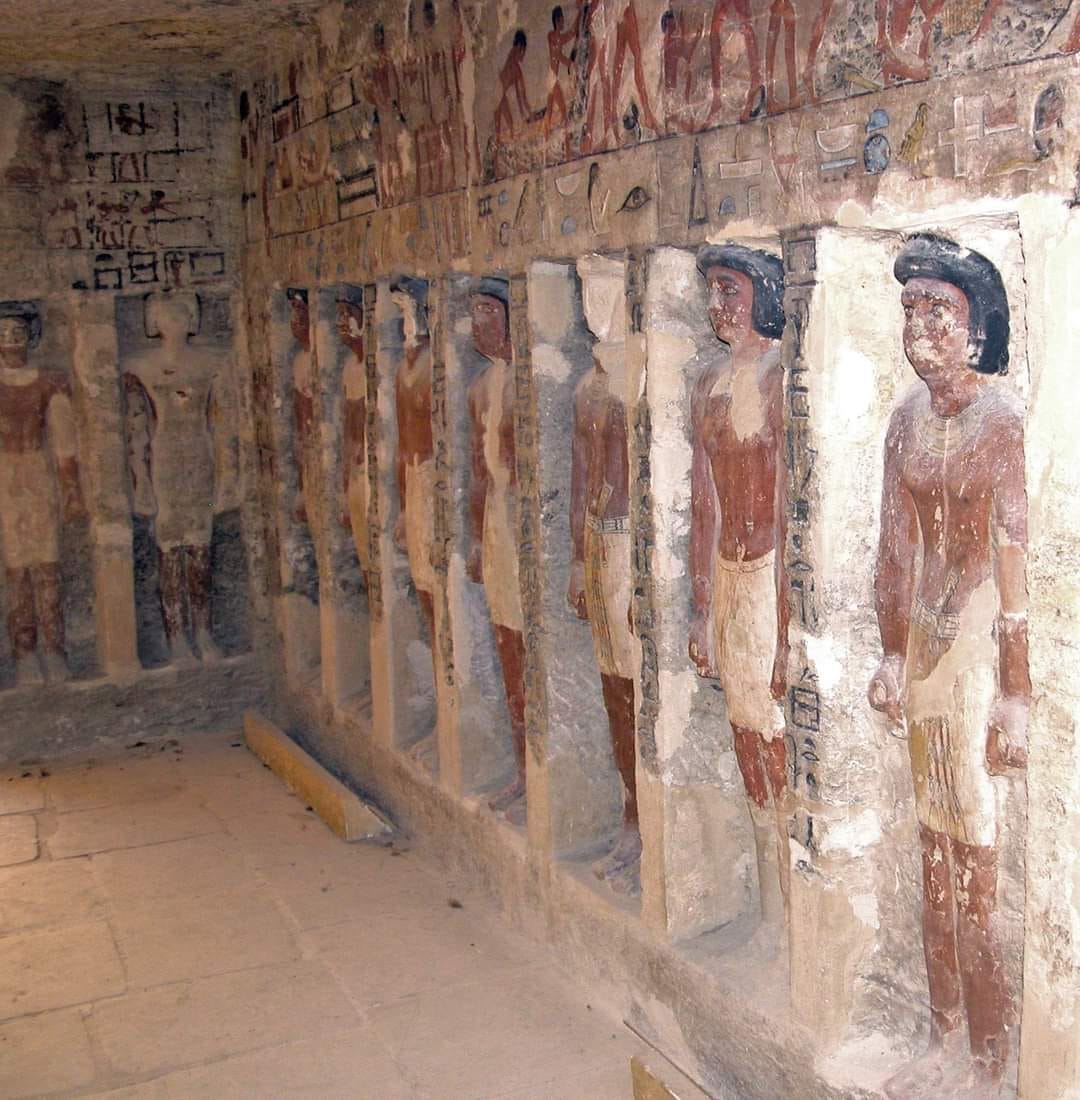 Esse fanno parte di un gruppo di quindici statuette (h. 35.2 x l. 18.5 cm) ognuna delle quali rappresenta una fase del processo di realizzazione e provano che nell’Antico Regno esso era stato perfezionato e codificato garantendo il raggiungimento delle proporzioni ideali a prescindere dalla grandezza del blocco da scolpire.