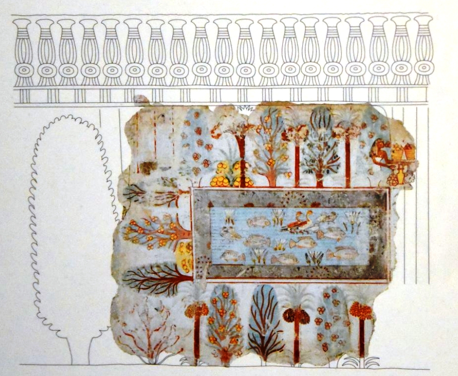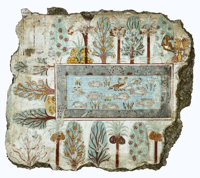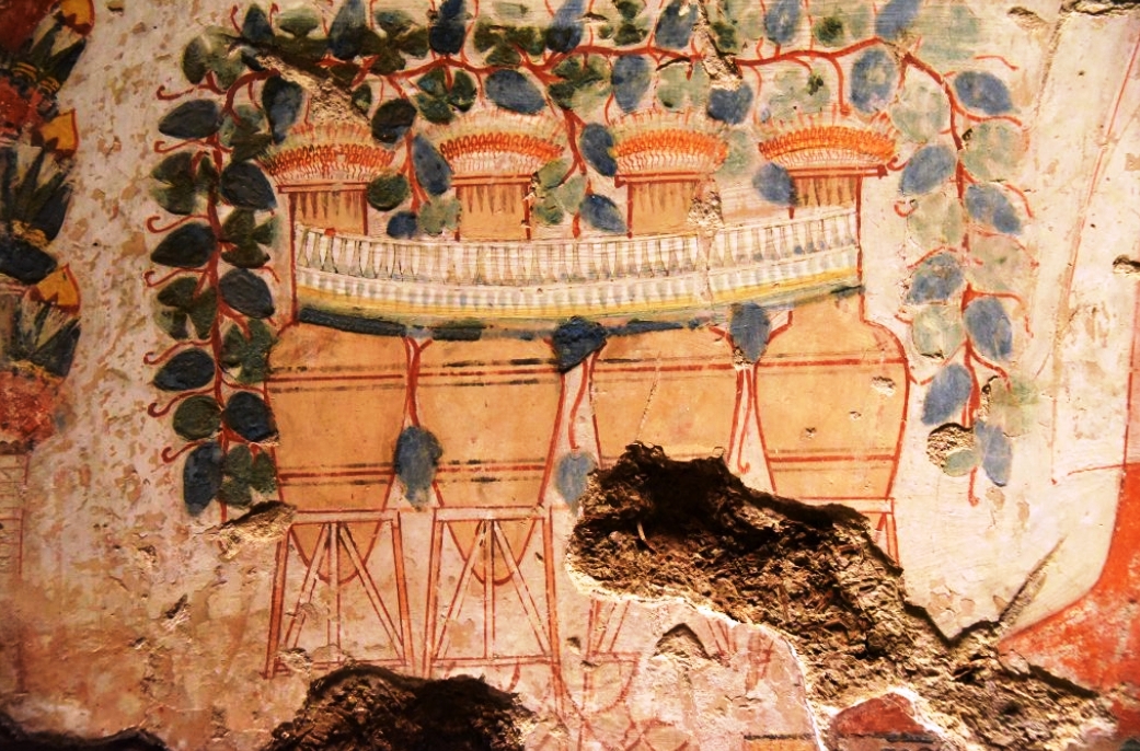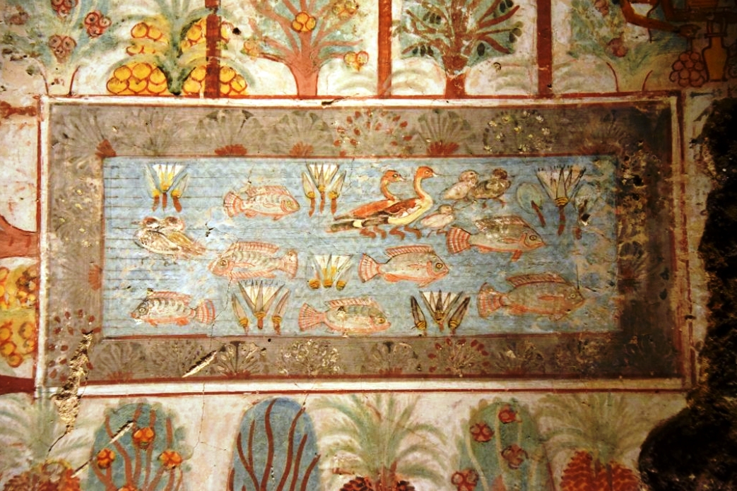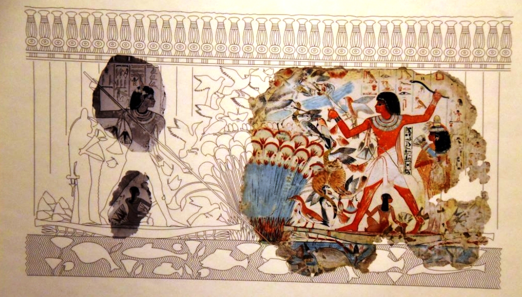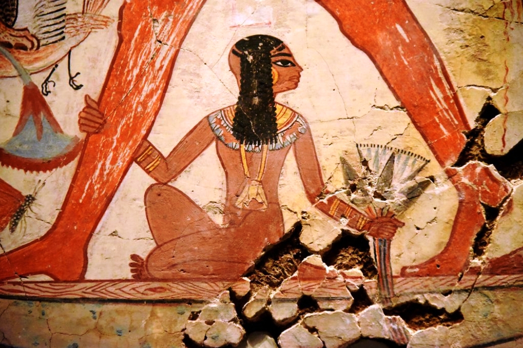 In questa immagine, proveniente dalla mastaba dell’alto dignitario Nikauisesi a Sakkara (VI dinastia), si notano personaggi a bordo di una barca che portano le fasce adornate da fiori di ninfea.