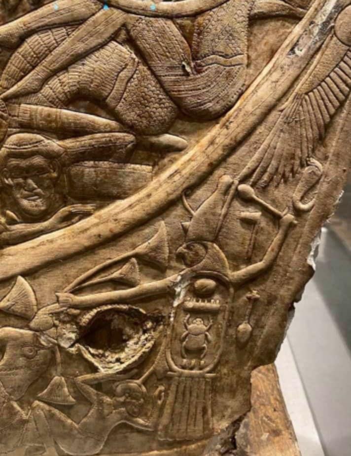 In questa foto si vede il dettaglio di Thutmose IV che insegue i nemici. Al suo fianco si intravede il dio Montu dalla testa di falco, che indossa sul capo piume e un disco solare.