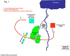 Ovviamente si tratta di un tranello, l’esercito confederato Hittita è infatti schierato alle spalle della città, ma Ramses“abbocca” e si rilassa nel campo intanto eretto, in attesa dell’arrivo e del consolidamento delle altre tre Divisioni. Muwatalli, Re Hittita, scatena allora i suoi carri da guerra che attraversano l’Oronte(fig. 1, n.ro 1), attaccano la Divisione Ra che sta sopraggiungendo (fig. 1, n.ro 2) e proseguono nell’attacco verso l’accampamento della Amon dove si trova Ramses (fig. 1, n.ro 3).