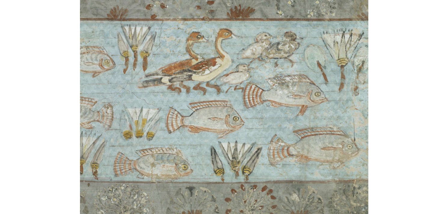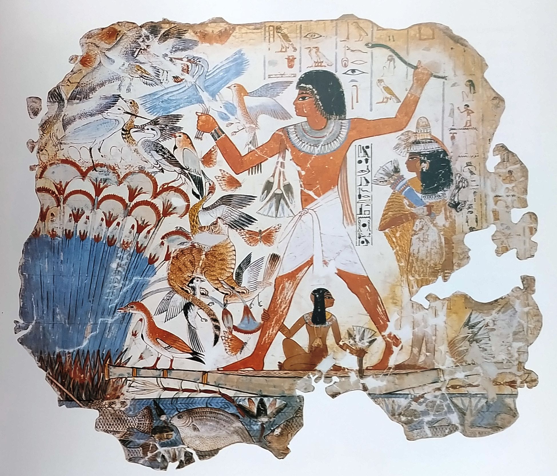 In questa immagine, proveniente dalla mastaba dell’alto dignitario Nikauisesi a Sakkara (VI dinastia), si notano personaggi a bordo di una barca che portano le fasce adornate da fiori di ninfea.