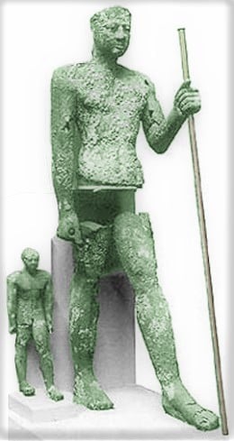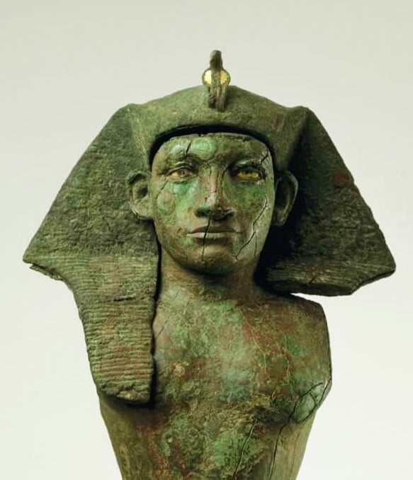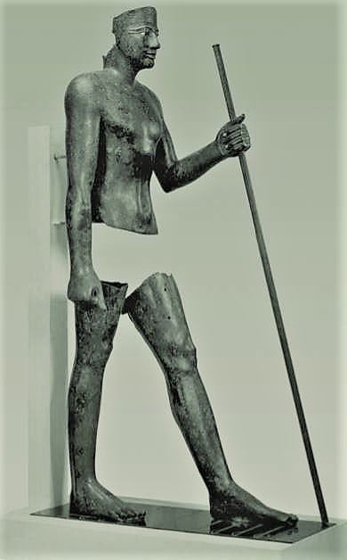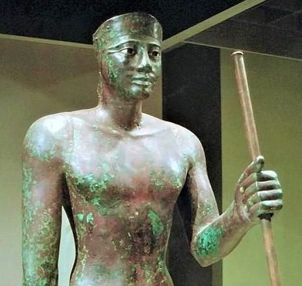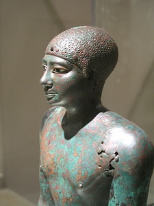 Per allietare un po’ questo post pesante, aggiungo la statua di Amenemhat III, circa 1800 a.C., in lega di Rame. Oggi la statua è nella collezione privata George Ortiz, ma proviene da Hawara, dove questo faraone della XII dinastia aveva una sede e lascia la propria piramide).