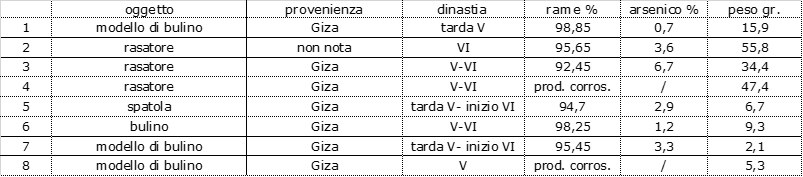 Tutto ciò che chiamiamo “bronzo” per l’Egitto dall’Epoca protodinastica fino all’inizio del Nuovo regno è in realtà più propriamente “rame arsenicale” dove la componente di arsenico prende il posto e le funzioni dell’odierno stagno nell’incrementare la durezza e la tenacia della lega. Dunque in epoche arcaiche l’arsenico è molto importante per la metallurgia di utensili, armi, manufatti in genere ed anche statue (perché oltretutto abbassa il punto di fusione del rame puro).