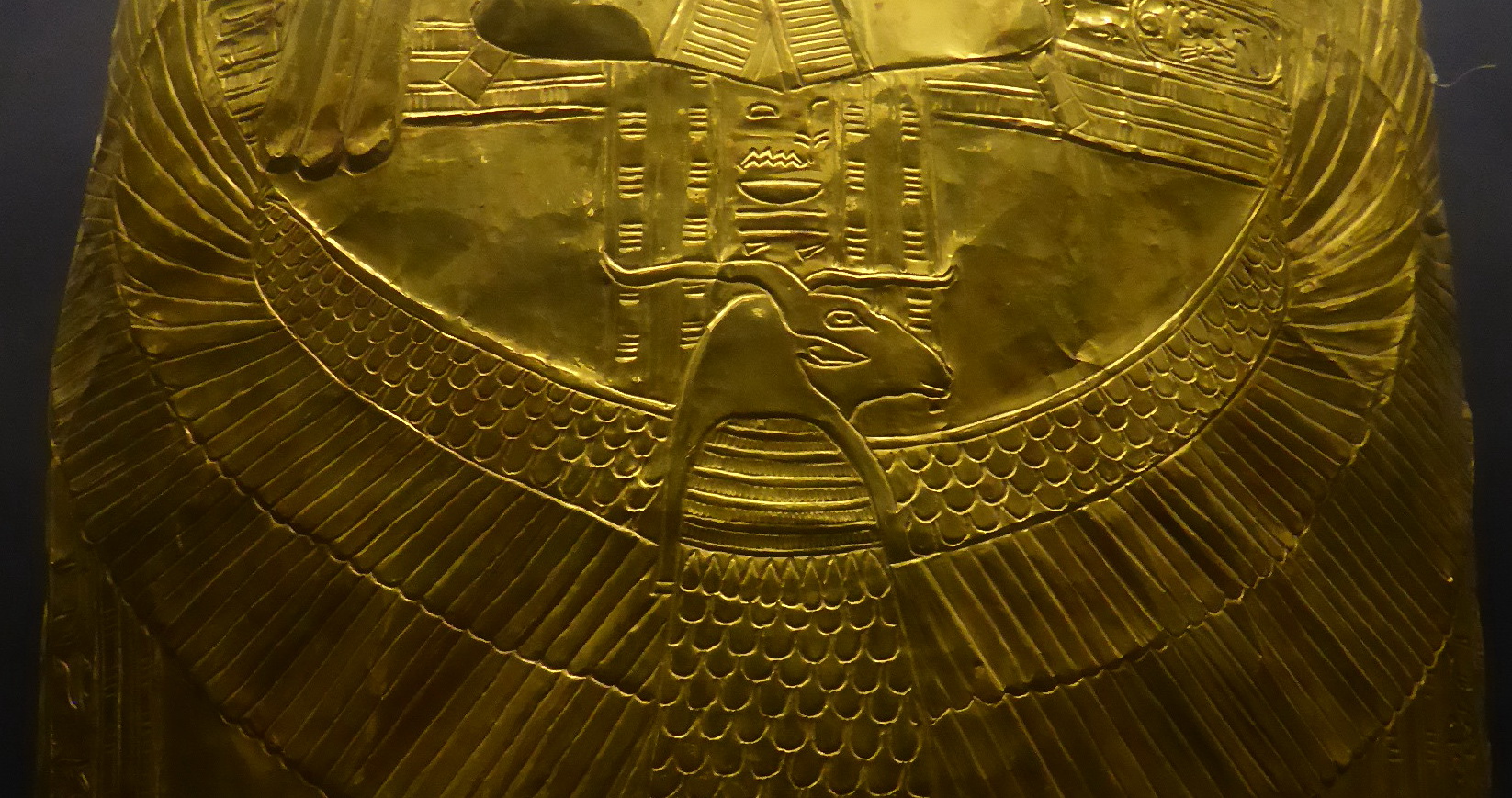 Nel particolare si vede come il disco solare abbia inscritto il prenomen di Tutankhamon (Nebkheperure, Signore del Divenire come Ra) con lo scarabeo alato (Kheper = trasformazione, divenire) sopra i tre trattini del plurale ed il simbolo Neb (il cesto di vimini = padrone, signore) e con il simbolo del disco solare di Ra tra le ali