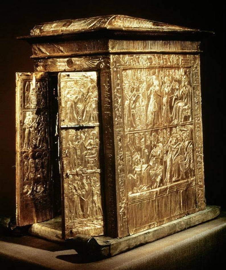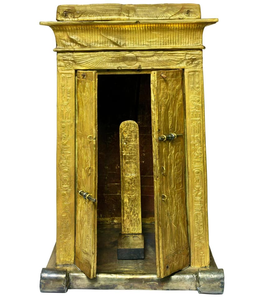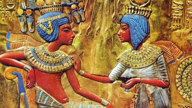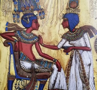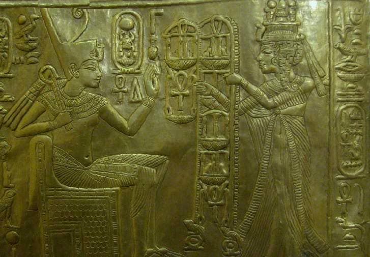 Ankhesenamon e Tutankhamon nel naos d’oro appartenente al corredo funerario di Tutankhamon