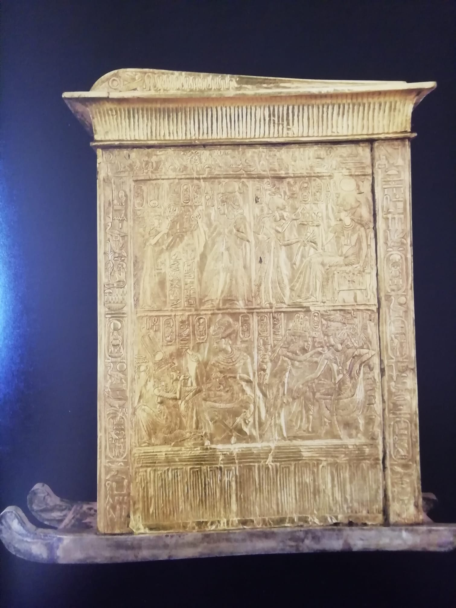 Esso è a forma di naos, è sorretto da quattro gambe sottili ed è profilato da un mosaico composto da rettangoli in terracotta rosa e blu alternati a tasselli di ebano; il registro superiore reca i cartigli dorati e in rilievo di Amenhotep III e di Tiye mentre quello inferiore è costituito da un fregio dorato composto da una successione di simboli augurali di vita e potere: due scettri “ouas” che racchiudono una croce “ankh” e che poggiano sul segno “neb”.