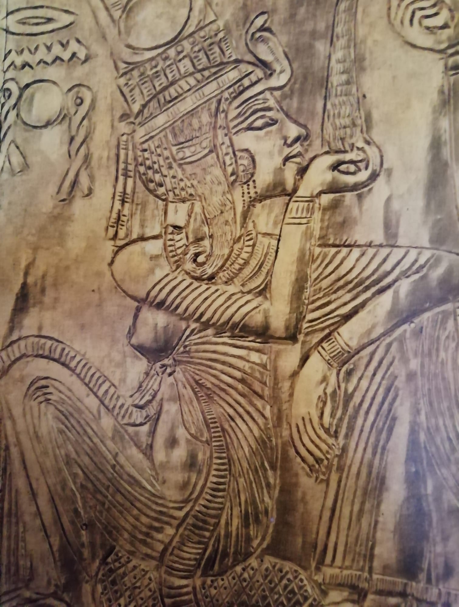 Il rilievo è ricco di simbolismo: un gatto tiene un’anatra al collo sotto il trono della regina e una scimmia e nemici stranieri giacciono sul cuscino del faraone, schiacciati sotto i suoi piedi.