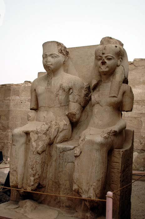 Le statue di Tutankhamon e Ankhesenamon a Luxor, rappresentati come Amon-Ra e Mut.