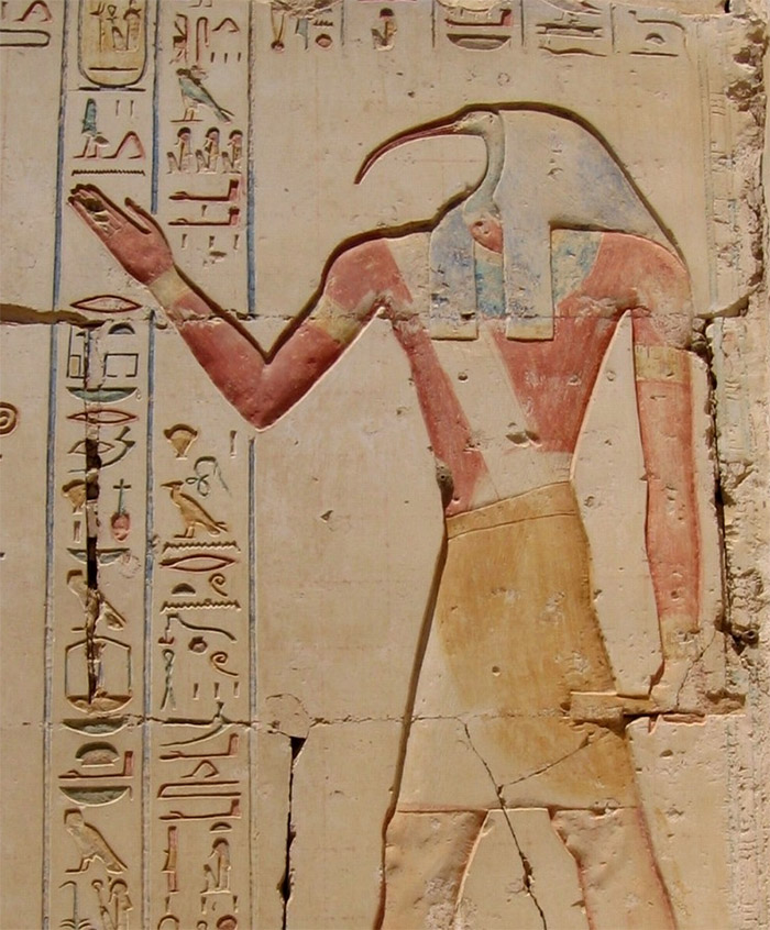 Il dio Ra, onnipresente, è rappresentato come un piccolo disco dietro Horus, e completa una trinità che si rinnova nella procreazione.