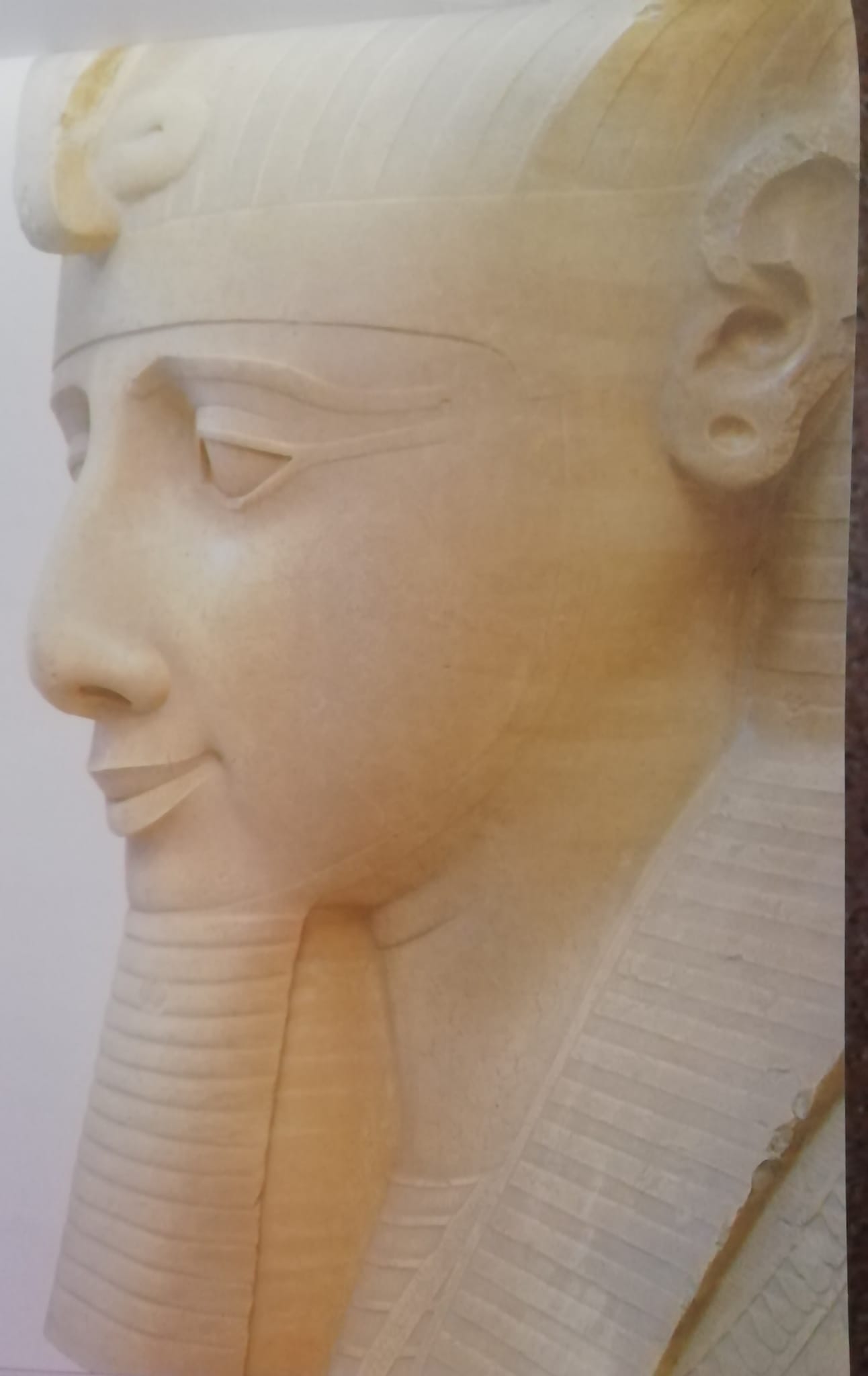 A destra; Tuia la regina Madre, sul capo il “modio”, una sorta di corona decorata con cartigli e l’ureo regale sulla fronte, un pezzo di stoffa nella mano destra