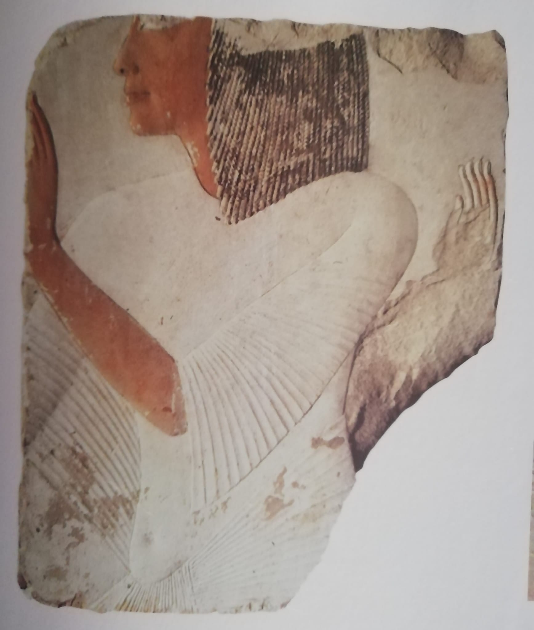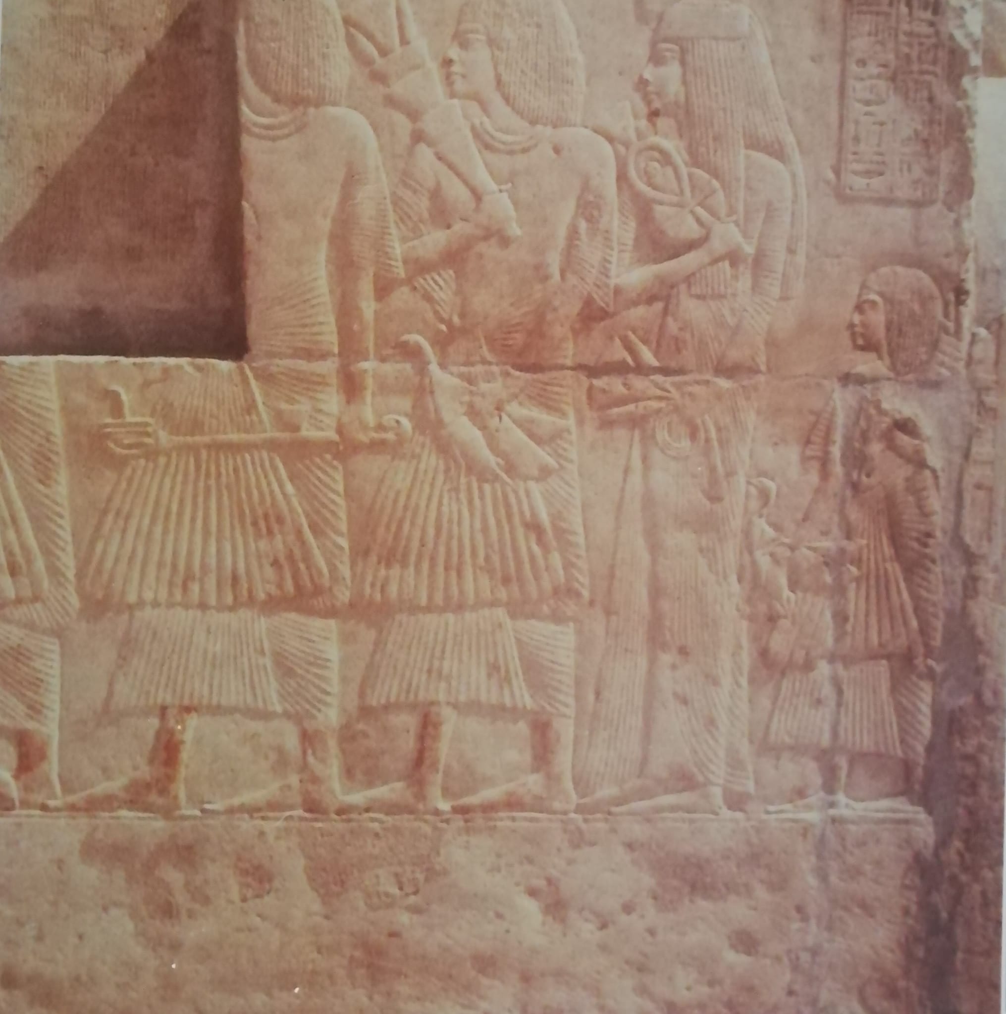 A sinistra: la figlia Bentanat, sul capo una grande parrucca un basso modio, due grandi piume e l’ureo regale sulla fronte, un pezzo di stoffa nella mano sinistra.
