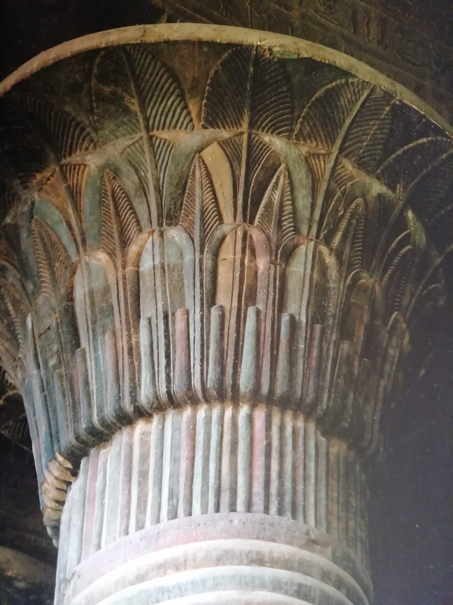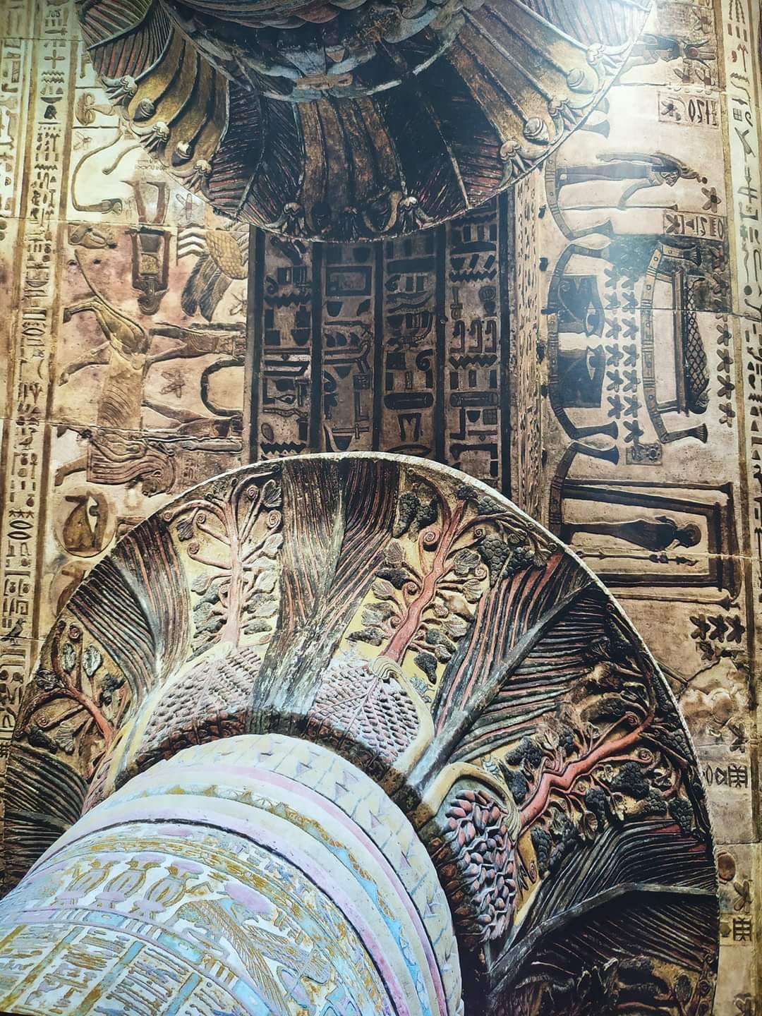 I capitelli della sala ipostila sono fitomorfi, con papiri e loto i cui colori variano dal rosso al blu, al bianco al verde per rendere più movimentata la scena e variare la ripetizione dello stesso schema.