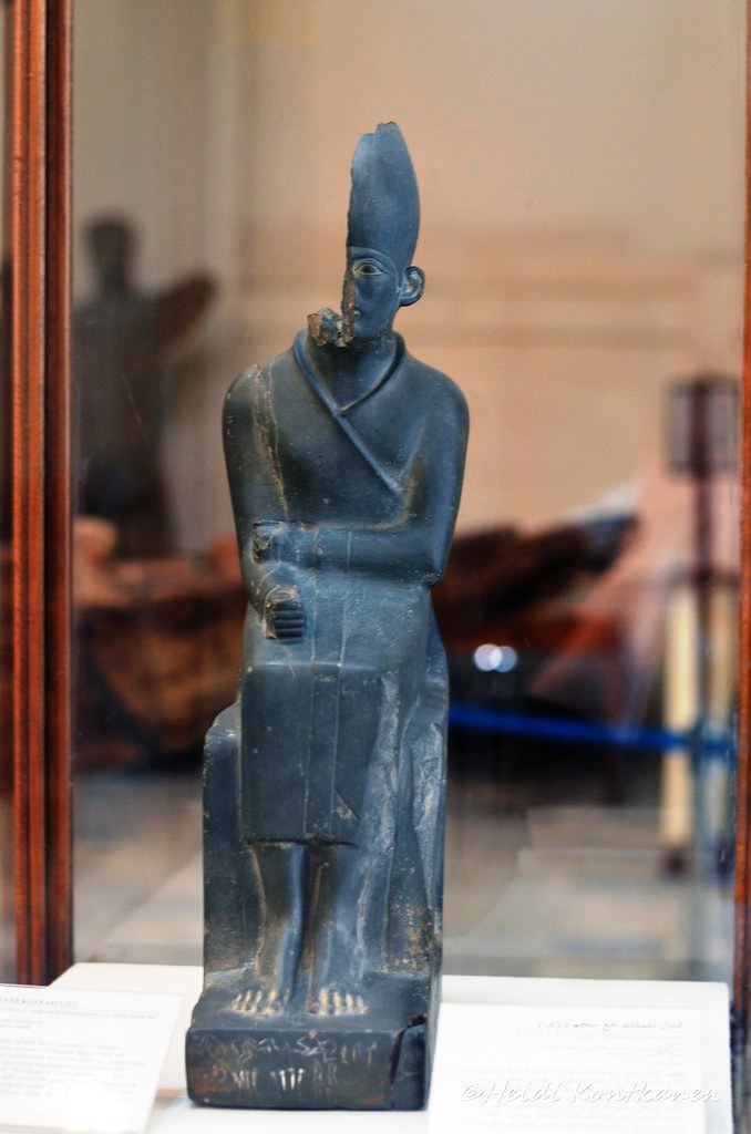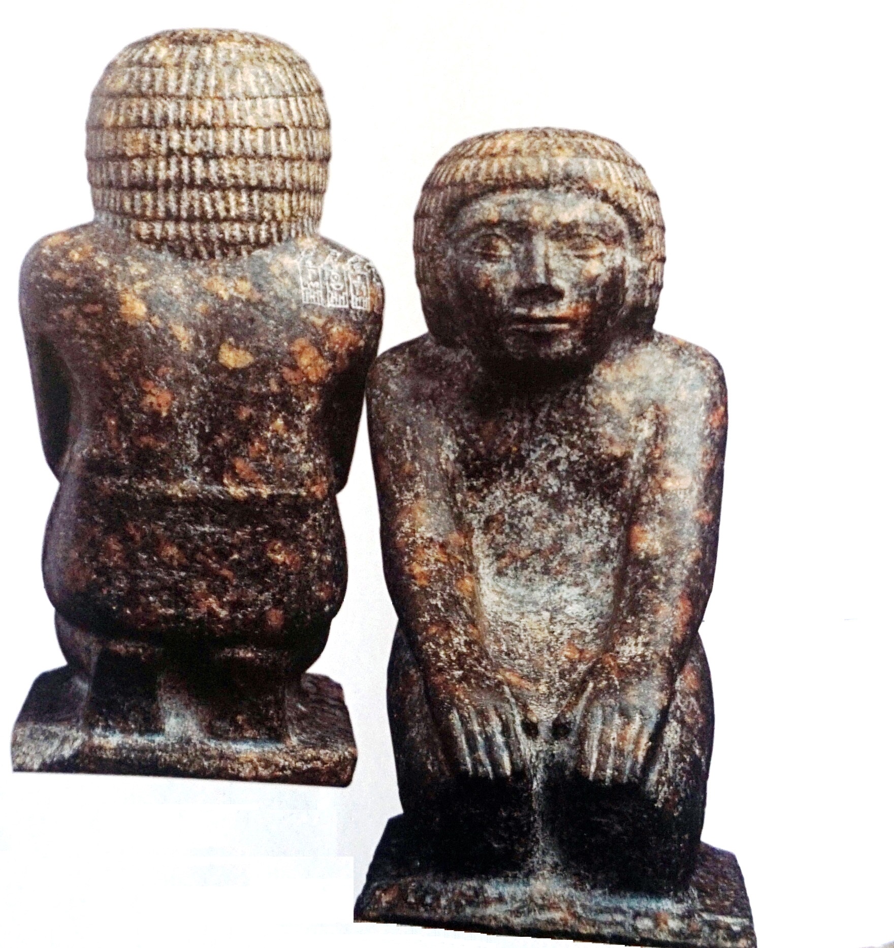 Immagine n. 6 Una delle rappresentazioni tipiche di Imhotep lo ritrae assiso mentre srotola un papiro, per dare risalto alla sua condizione di saggio. Il copricapo a calotta gli conferisce l’aspetto del dio Ptah, considerato suo padre. I suoi piedi, calzati con sandali, poggiano su una piccola base quadrata con inciso il nome di Imhotep e del dedicante, Pediamun, figlio di Bes e Irteru. Museo Egizio del Cairo, Epoca tarda, ca. 664-332 a.C (© Ali Radwan, “I Tesori delle Piramidi” a cura di Zahi Hawass, pag. 88)
