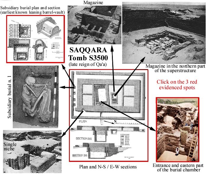 La tomba di Anedjb (mastaba 3038)*, è stata anche proposta come prototipo della Piramide a Gradoni ed inoltre, è riscontrabile una certa affinità tra la planimetria del tempio funerario di Djoser e il luogo di culto adiacente al lato settentrionale della mastaba 3505 di Saqqara che, secondo alcuni appartenne a Qa’a, l’ultimo sovrano della I Dinastia, ma che il rinvenimento di una grande stele in calcare con relative iscrizioni di nomi e titoli, la farebbero con tutta probabilità attribuire al suo funzionario Merka, gran sacerdote e profeta di Neith.
