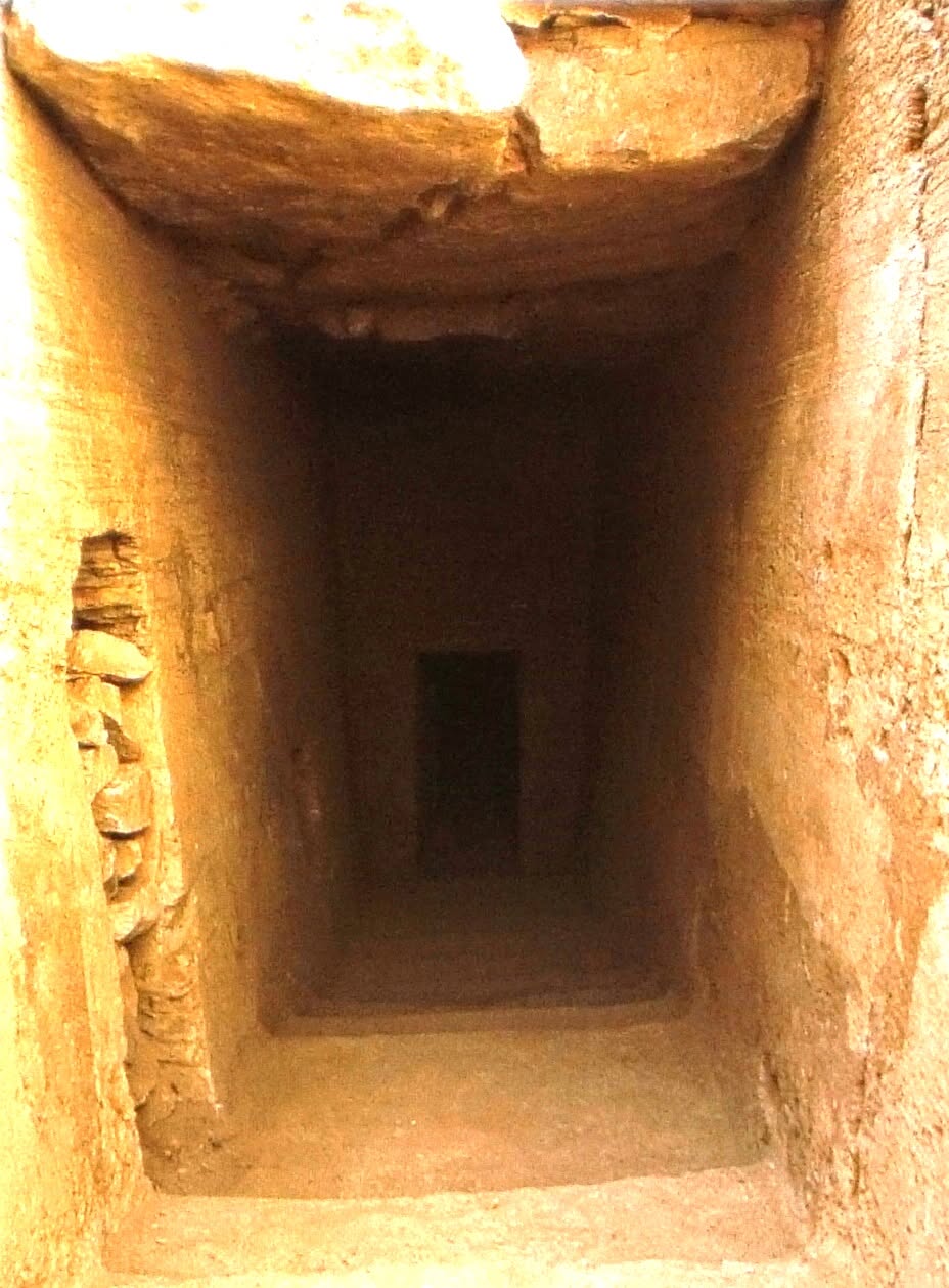 Quando furono gettate le prime fondamenta della mastaba, gli egizi scavarono un enorme pozzo a sezione quadrata di 7 metri per lato, nel quale avevano previsto di allestire la tomba reale. Per permetterne l’accesso, fu scavato un tunnel verso nord che terminava in una trincea a cielo aperto, in cui poter continuare a circolare e poi per essere utilizzata in previsione dei funerali. Siccome Il pozzo raggiunse successivamente una profondità di 28 metri, il tunnel fu notevolmente ampliato fino a raggiungere un’altezza di 15 metri e lo spazio aperto, dopo essere stato in gran parte riempito con muratura a vista, fu trasformato in una china che, attraverso la facciata nord della piramide, sbucava all’interno del tempio funerario (Immagine n. 29).