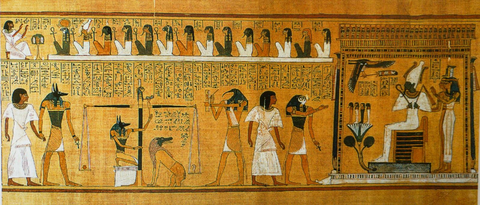 Sappiamo che gli egizi erano considerati ancora in epoca ellenistica il popolo più pio della terra. Tralasciando ogni discorso su cosmogonie, divinità miti e credenze, ciò che si evidenzia con estrema chiarezza è che avevano elaborato un sistema religioso che, a parte la brevissima parentesi amarniana, si mantenne, ovviamente con evoluzioni, sincretismi e assimilazioni, stabile per tutta la durata della loro civiltà. Caratteristica fondamentale della loro visione fu la fiducia incrollabile in un’esistenza ultraterrena che, inizialmente riservata ai sovrani e ad una ristretta élite, divenne universale a partire dalla caduta dell’Antico Regno grazie a quel processo conosciuto come “democratizzazione dell’aldilà” (Assmann preferisce il termine “demotizzazione”) che ritroviamo ormai perfettamente compiuto nel Medio Regno*. Chiaramente l’accesso a questo “paradiso” (che ricordiamolo per gli egizi, così innamorati della vita, contrariamente a quanto si potrebbe pensare, ne era una esistenza migliorata e beata nei “Campi di Ialu”o “Campi Hotep”) era subordinato ad un giudizio che il defunto (più precisamente il suo cuore, sede della coscienza) doveva sostenere di fronte a 42 giudici**. Qui entrano prepotentemente in gioco alcuni degli aspetti di Ma’at: equilibrio, verità, giustizia. Sui due piatti della bilancia venivano posti rispettivamente il cuore e una piuma, emblema della divinità. In pratica il defunto affermava di non aver compiuto azioni che ne trasgredivano i precetti. L’equilibrio dei piatti avrebbe sancito la veridicità delle affermazioni, la proclamazione del defunto come mꜣꜥ ḫrw (lett. “giusto di voce”)e l’accesso all’aldilà.