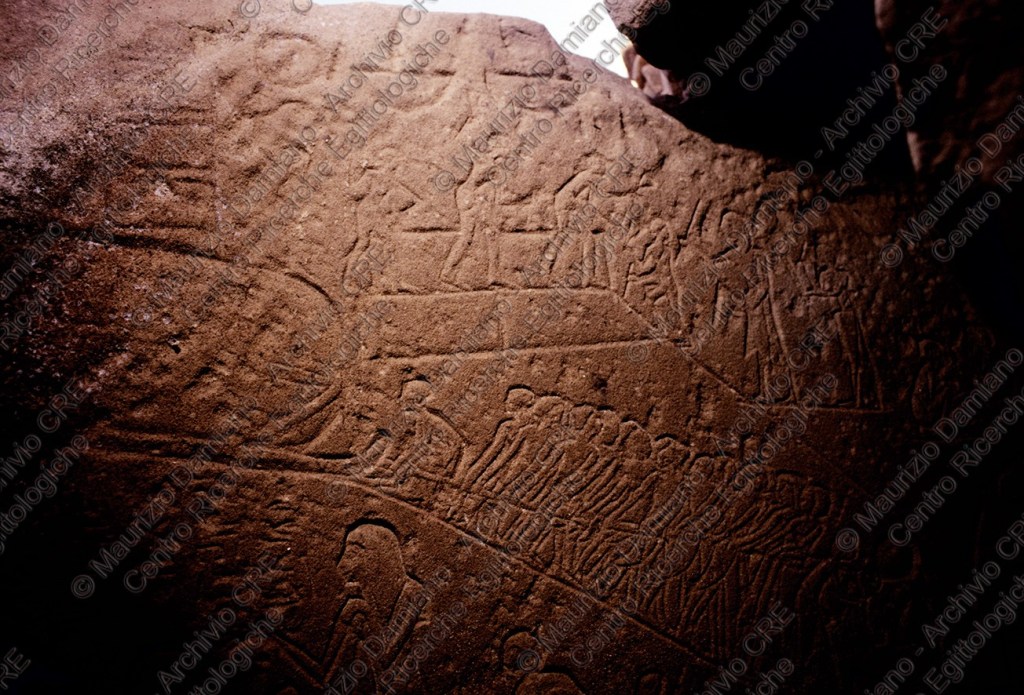 Inoltre, le rappresentazioni di imbarcazioni, di grandi figure femminili con le braccia sollevate, piante, animali del deserto e segni indicanti l’acqua, appaiono collegate a credenze sull’esistenza di un mondo oltremondano e sulla fiducia in una rinascita. Sempre durante questo periodo, le rappresentazioni di santuari dimostrano che già esistevano centri cultuali e finanche una sorta di specialisti della religione che più tardi sarebbero andati a formare una vera e propria casta sacerdotale***.