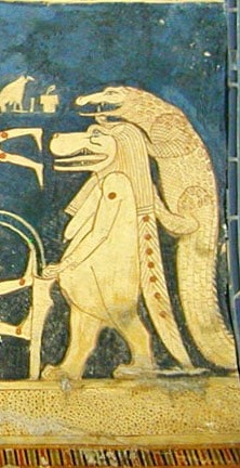 Era anche associata al demone detto “il grande divoratore” o “l’ingoiatore dei peccatori”, la divinità guardiana del secondo cancello della Duat che accanto ad un lago di fuoco attendeva i defunti per divorarli se il giudizio finale fosse stato negativo.