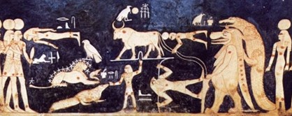 Un interessante parallelismo va fatto con le mucche e i vitellini in corteo nelle rappresentazioni del Nuovo Regno, dove i vitellini sono sovente rappresentati con una zampa amputata. Secondo un’interpretazione, si tratta di una rappresentazione di Horus a cui Iside amputa e poi sostituisce la mano che aveva toccato il seme di Seth, secondo il racconto della storia di Horus e Seth.