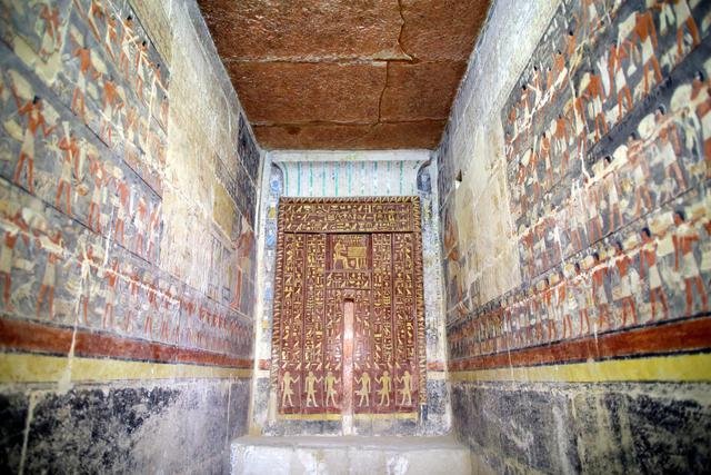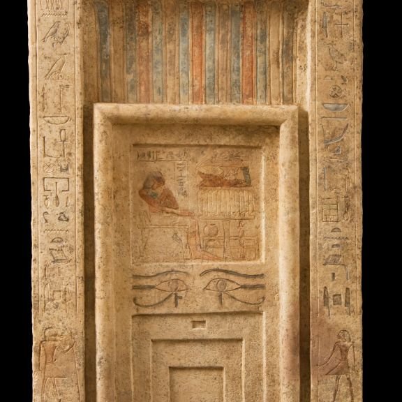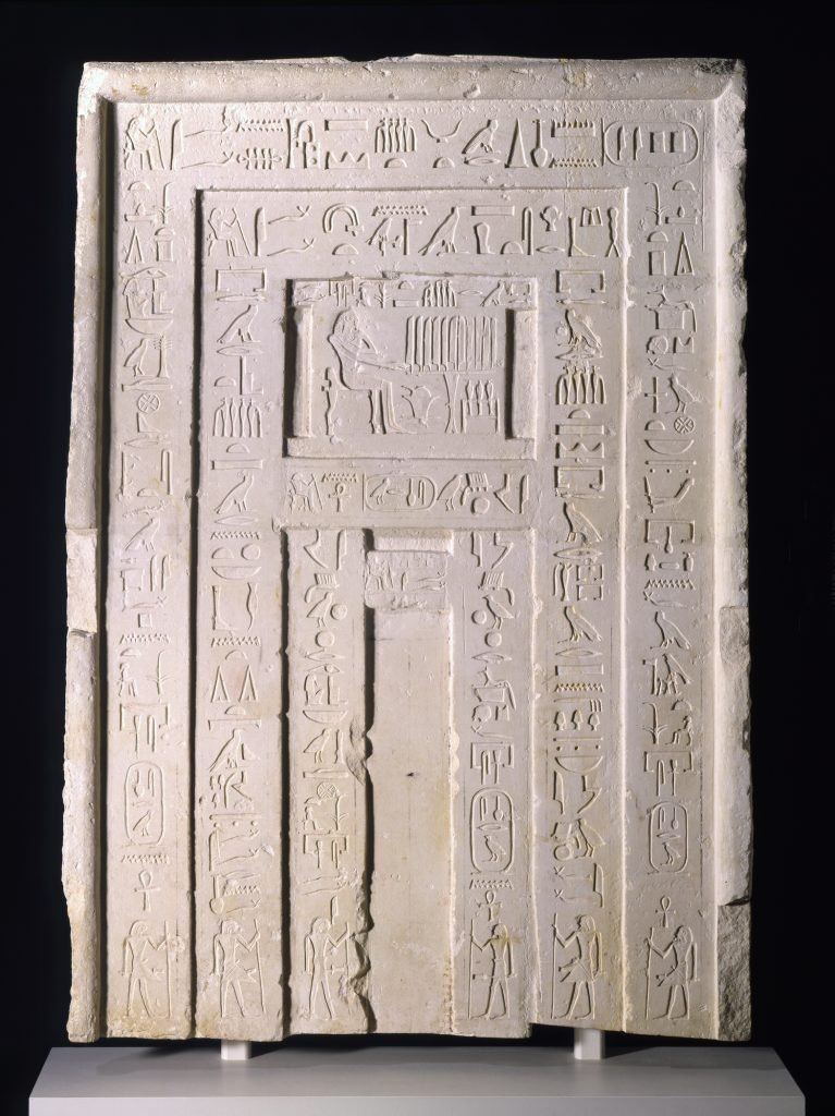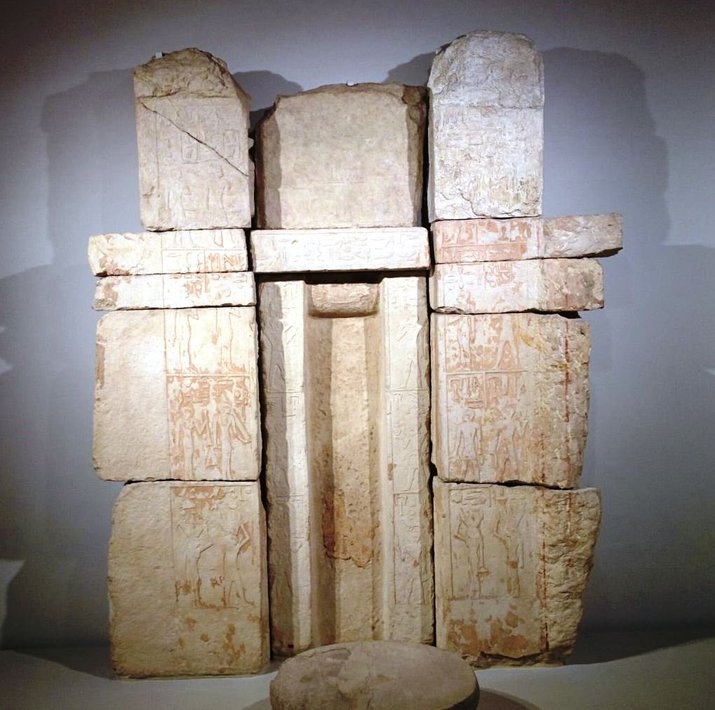 È un elemento architettonico in uso dall’epoca predinastica fino alla fine del Primo Periodo intermedio; la falsa porta era collocata sul lato ovest della mastaba, associato al mondo dei morti, e raffigurava una simbolica porta che metteva magicamente in comunicazione il mondo dei vivi e l’Aldilà e permetteva al Ka del defunto di raggiungere la tomba per raccogliere quanto veniva depositato sulla tavola delle offerte.