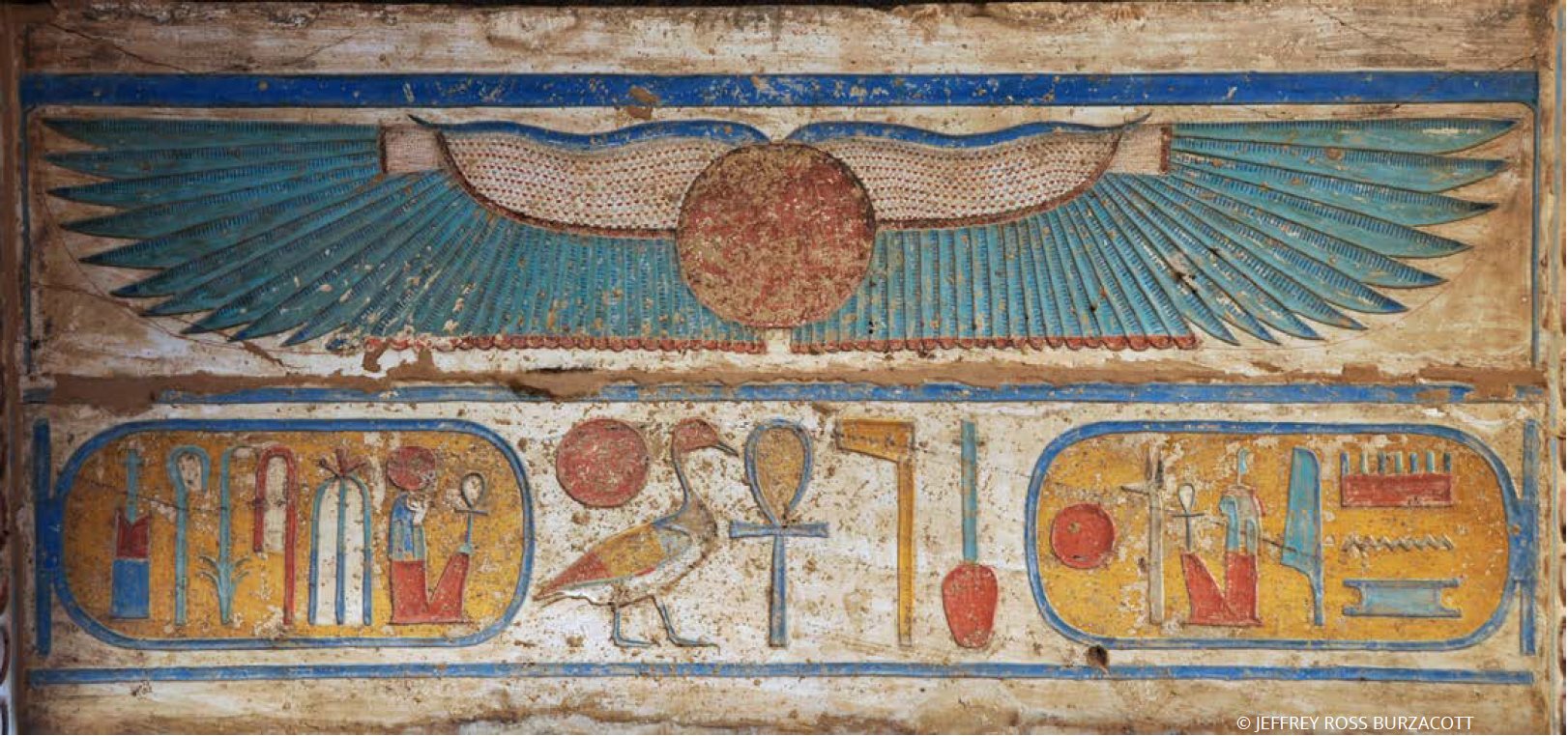 L’esempio ricco di colori qui mostrato, proviene dal tempio di Ramses III a Medinet Habu. Esso decora il lato inferiore di un massiccio architrave in calcare che sovrasta l’ingresso ad un porticato rialzato tra la Seconda Corte e la Sala Ipostila del tempio (fotografia: Jeffrey Ross Burzacott).