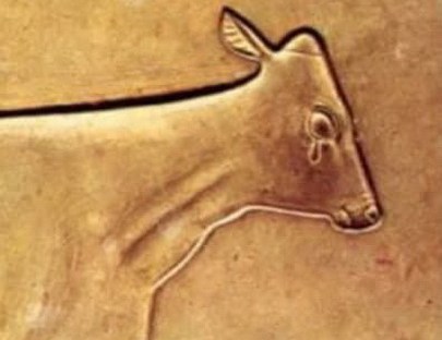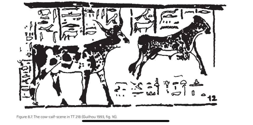 Il motivo della mucca con la lacrima fu un’invenzione limitata quindi solo alla XI Dinastia e in seguito si preferì utilizzare il motivo della mucca e vitellino che muggiscono quando separati, secondo una tradizione già in voga nell’Antico Regno.