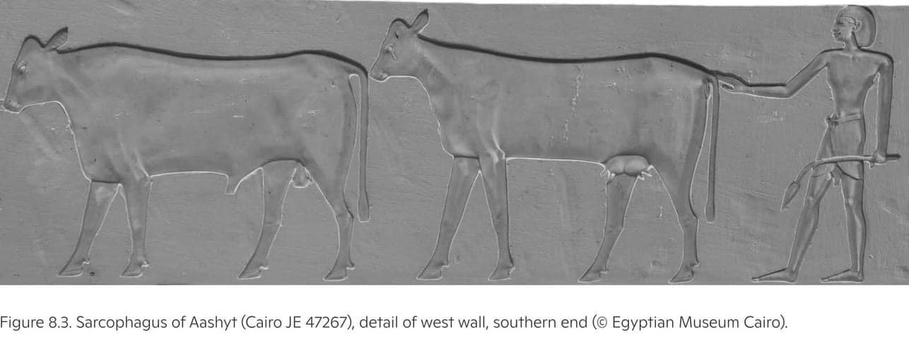 La rappresentazione delle mucche nei vari contesti dei due sarcofagi ha certamente una funzione rituale: non è una semplice rappresentazione della vita quotidiana e dell’’approvvigionamento di cibo per il defunto. Nel sarcofago di Aashyt è presente un altare di fronte alla mucca, un’indicazione certa di un contesto rituale.