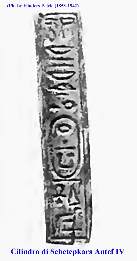 Sehetepkara Antef IV (Colui che rende felice il Ka di Ra) forse diciassettesimo (?) sovrano della XIII dinastia secondo il Canone Reale. Di lui non si sa praticamente nulla nonostante siano state rintracciate testimonianze archeologiche, infatti compare anche nella lista reale di Karnak oltre che sul basamento di una statua rinvenuta a Medinet Madi, oggi al Museo del Cairo. Con un altro nome compare su un cilindro rinvenuto dall’egittologo Flinders Petrie nella forma che compare nella foto 3.