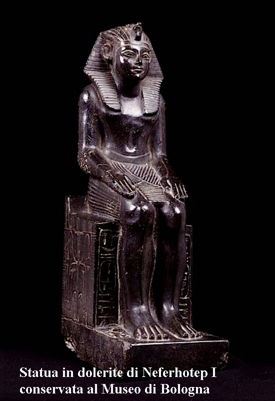 Al Museo Archeologico di Bologna è conservata una stupenda statuetta in microgabro o dolerite di Neferhotep. Il faraone è seduto su un seggio cubico dallo schienale appena accennato, tiene le mani appoggiate alle cosce e le gambe leggermente divaricate. Il gonnellino plissettato di tipo arcaico (shendit) e il copricapo in tessuto di lino (nemes), con l’ureo sulla fronte, permettono di identificarlo quale sovrano d’Egitto, così come i cartigli con i primi due nomi della sua titolatura incisi sul trono, ai lati delle gambe. Le iscrizioni che confermano che il sovrano è: “Il dio buono, il Signore delle Due Terre, Neferhotep, amato di Sobek di Shedet, Horo che risiede in Shedet” portano a credere che questa provenga dal tempio del dio coccodrillo Sobek di Shedet, l’attuale Medinet el Fayyum.
