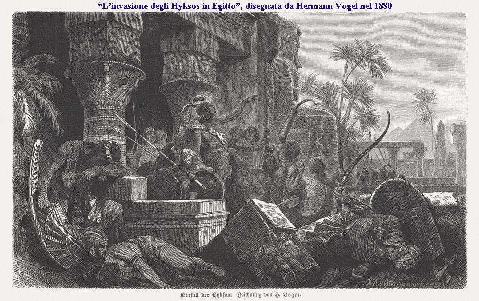 <<…….Tutimaios. Durante il suo regno, per cause a me ignote, l’ira del Signore si abbatté su di noi; e all’improvviso dalle regioni dell’Oriente un’oscura razza d’invasori si mise in marcia contro il nostro paese sicura della vittoria. Con la sola forza numerica e senza colpo ferire s’impradronirono facilmente delle nostre terre; e avendo sopraffatto i reggitori del paese, bruciarono spietatamente le nostre città, rasero al suolo i templi degli dèi e rivolsero la loro crudeltà contro gli abitanti, massacrandone alcuni, riducendo in schiavitù le mogli ed i figli degli altri. Finalmente elessero re uno dei loro di nome Salitis. Egli pose la sua capitale a Menfi esigendo tributi dell’Alto e Basso Egitto e sempre lasciando dietro di sé guarnigioni nei posti più favorevoli…….>>.