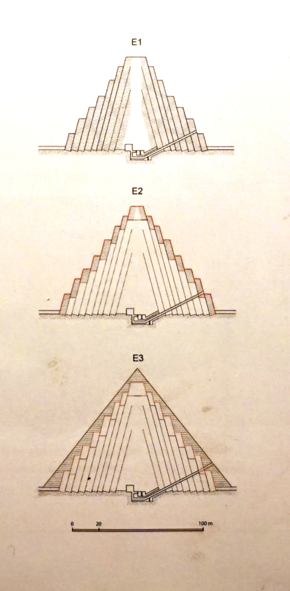 Infine, fu deciso di modificare radicalmente il monumento (stato E3) sovrapponendovi un ulteriore involucro in muratura, ma questa volta disposto in strati orizzontali, in modo da fargli assumere la forma completamente nuova di una piramide dal profilo triangolare. A causa della struttura esistente, le facce risultanti assunsero una pendenza dell’ordine di 52°, un’inclinazione che più tardi fu ripresa per la piramide di Khufu.