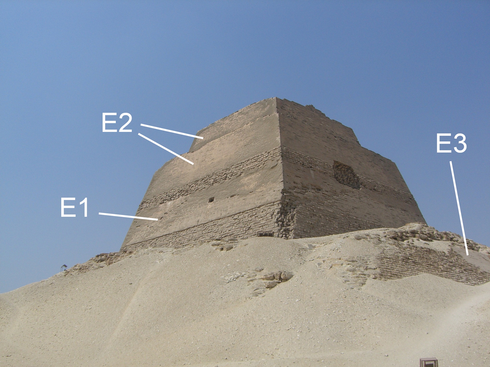 Il primo stadio (E1) fu edificato, attenendosi rigorosamente allo schema costruttivo della III Dinastia, realizzando otto fasce concentriche di muratura inclinata, appoggiate l’una contro l’altra fino a formare un tronco centrale. Si pervenne così a una piramide a sette gradoni avente un’altezza di circa 65 metri, le cui facciate furono poi accuratamente rivestite. Successivamente, si decise di aumentarne le dimensioni aggiungendo una sezione supplementare di muratura e rialzando ogni gradone fino a raggiungere un totale di otto livelli (stato E2). Anche in questo caso l’edificio fu completato, come dimostra il perfetto rivestimento della parte torreggiante attualmente esposta (Immagine n. 14).