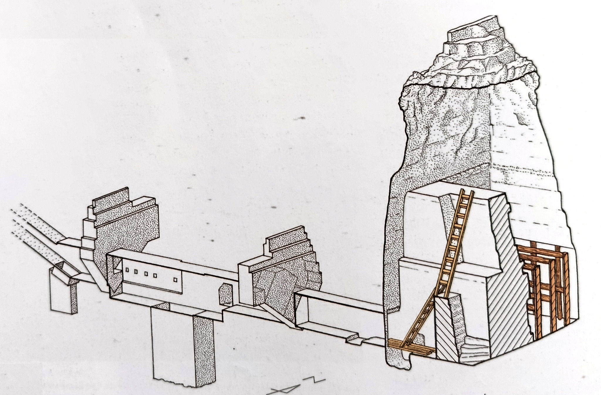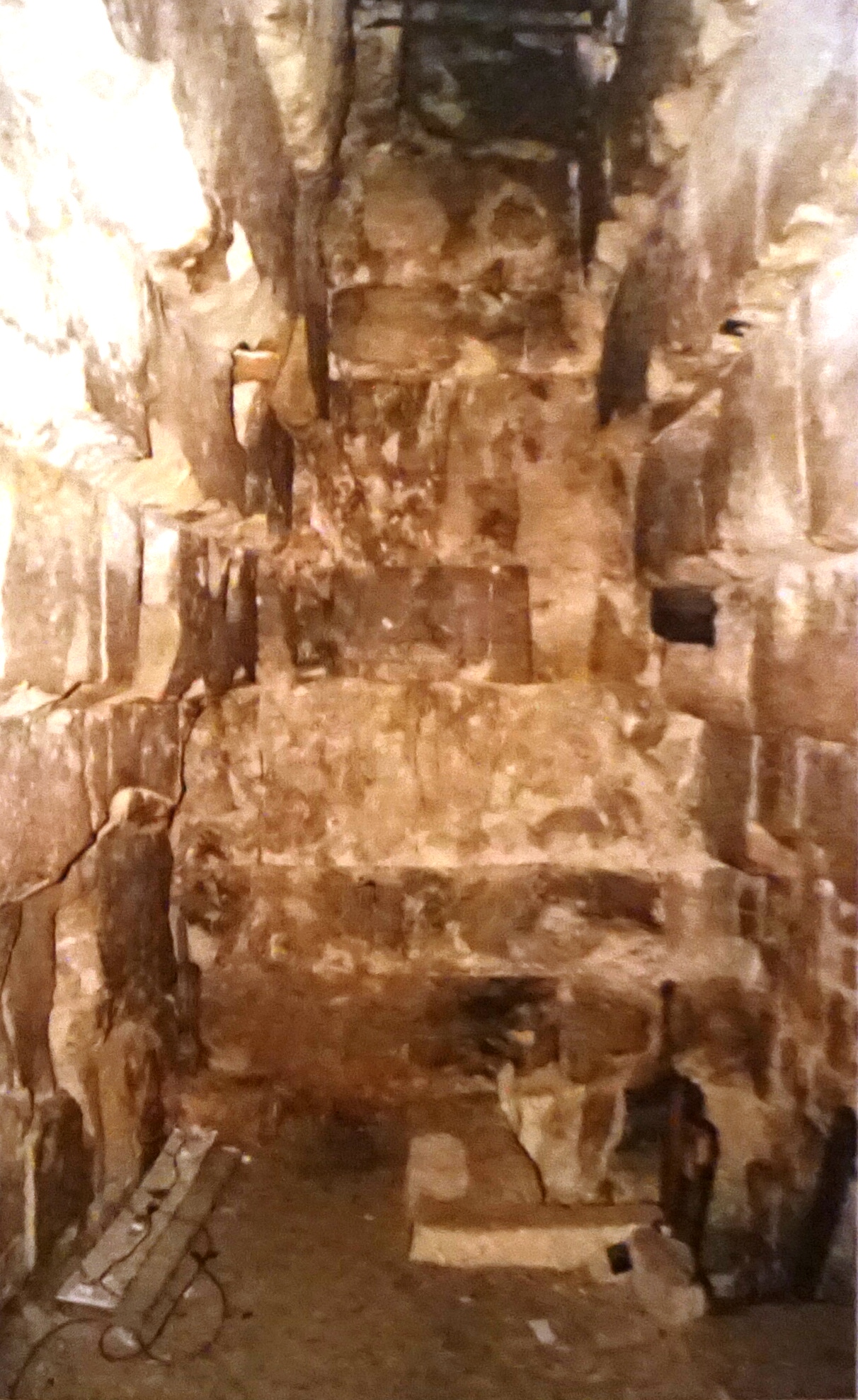 Dal muro meridionale un piccolo passaggio conduce ad un condotto verticale, generalmente definito “camino”, che si innalza fino ad un’altezza di oltre 15 metri ed è privo di aperture. Negli alloggiamenti laterali, la presenza di due blocchi disposti di taglio e collocati in posizione di attesa sembra avvalorare l’ipotesi che fossero destinati a sigillare questo ambiente (Immagine n. 26).