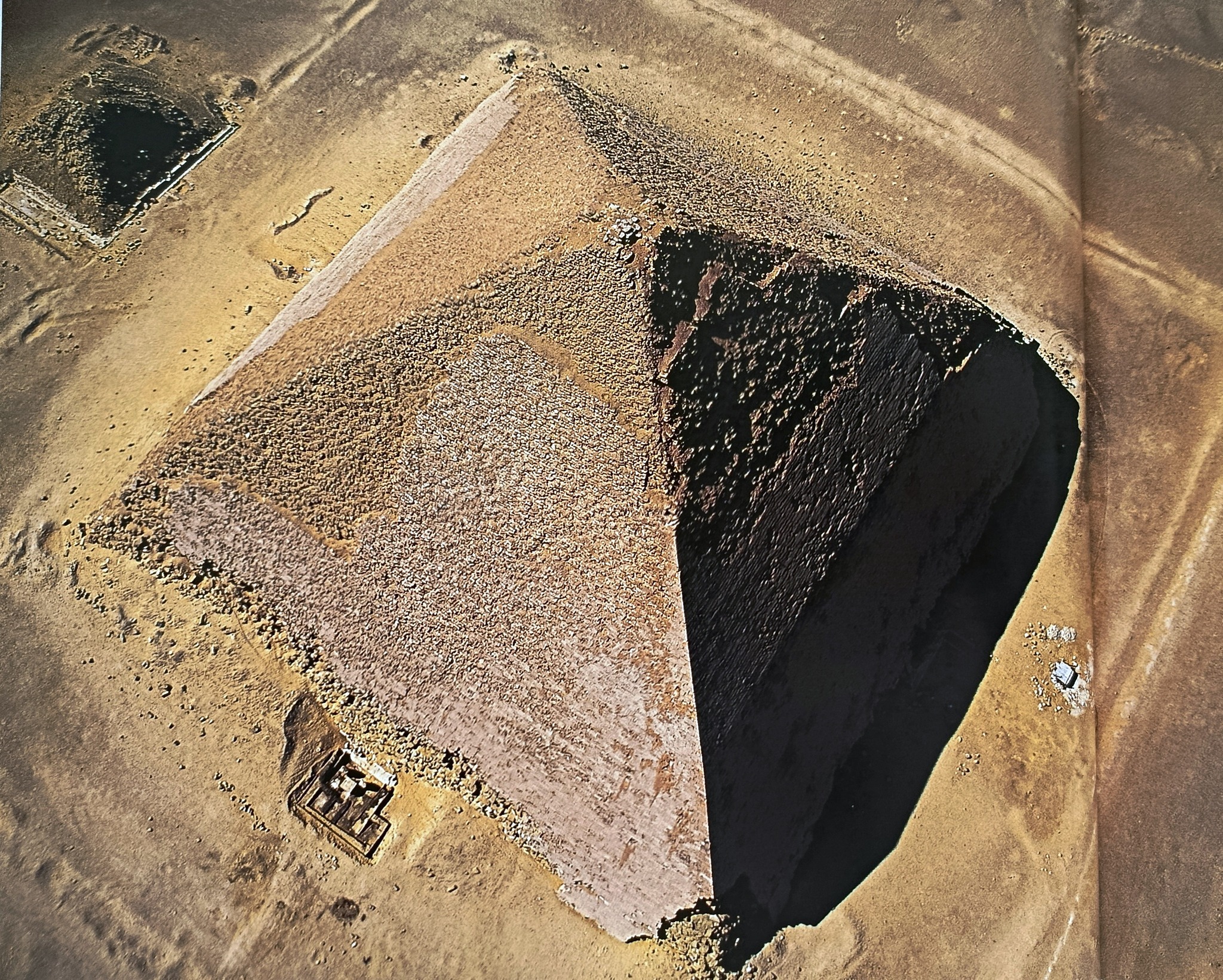 A proposito del passaggio da una piramide a gradoni ad una dalla forma geometrica pura, è fondamentale considerare che una simile evoluzione non è affatto consequenziale, come verrebbe naturale da pensare; lo dimostra il fatto che nessuna delle civiltà che costruirono piramidi a gradoni pose in atto la trasformazione verso quelle a pareti lisce. Il progresso tecnologico che portò alla conformazione tipica è il risultato di un’avventura unica e straordinaria che avvenne proprio ai tempi di Snefru. Per la nuova piramide di Dashur sud (Immagine n. 19), che a causa del suo aspetto finale è oggi nota, secondo le varie denominazioni, come “Piramide romboidale”, “a doppia pendenza” oppure “piegata”, si previdero anche audaci miglioramenti alle camere. Gli ambienti interni, infatti, avrebbero dovuto avere volte a mensoloni, come quelle già concepite a Meidum, ma qui ampiamente perfezionate e alte fino a 15 metri. Purtroppo, a causa dei cedimenti del terreno e dei conseguenti danni occorsi alla struttura in fase di edificazione, si resero necessarie modifiche di tale portata da produrre un sistema interno di vani incredibilmente complicato e difficile da ricostruire.