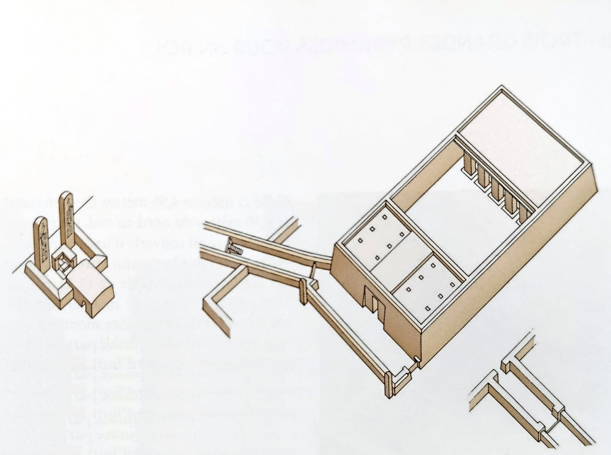 La struttura del complesso funerario è caratterizzata da una netta cesura con quella della dinastia precedente, nel senso che la piramide acquisisce, da questo momento, un’importanza assolutamente predominante all’interno del quadro d’assieme. Gli edifici cultuali presenti nel complesso di Djoser, così vari e molteplici, appaiono qui sotto una forma molto semplice (oggi diremmo “minimalista”) riducendosi, in pratica, ad una cappella addossata alla facciata orientale. Questo edificio, di circa 9 metri di lato, comprende un piccolo corridoio a zig-zag che conduce a un cortile interno, al centro del quale si ergono, accanto a un tavolo sacrificale, due alte stele monolitiche con la sommità arrotondata (Immagine n. 10). Tutto, in questo luogo, mostra segni di incompiutezza: rifacimento delle pareti interrotto, iscrizioni contemporanee assenti e stele vergini.